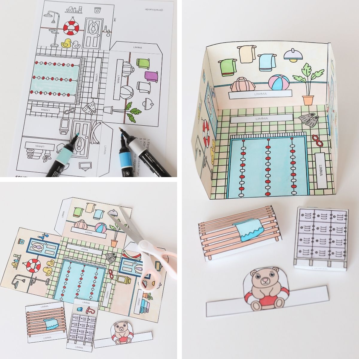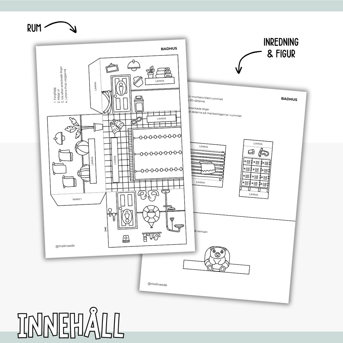 Pyssla ett dockhus i 3D. Färglägg, klipp ut och limma ihop. Alla rum i serien passar med varandra, bygg ut och mixa som du vill i ditt dockhus.