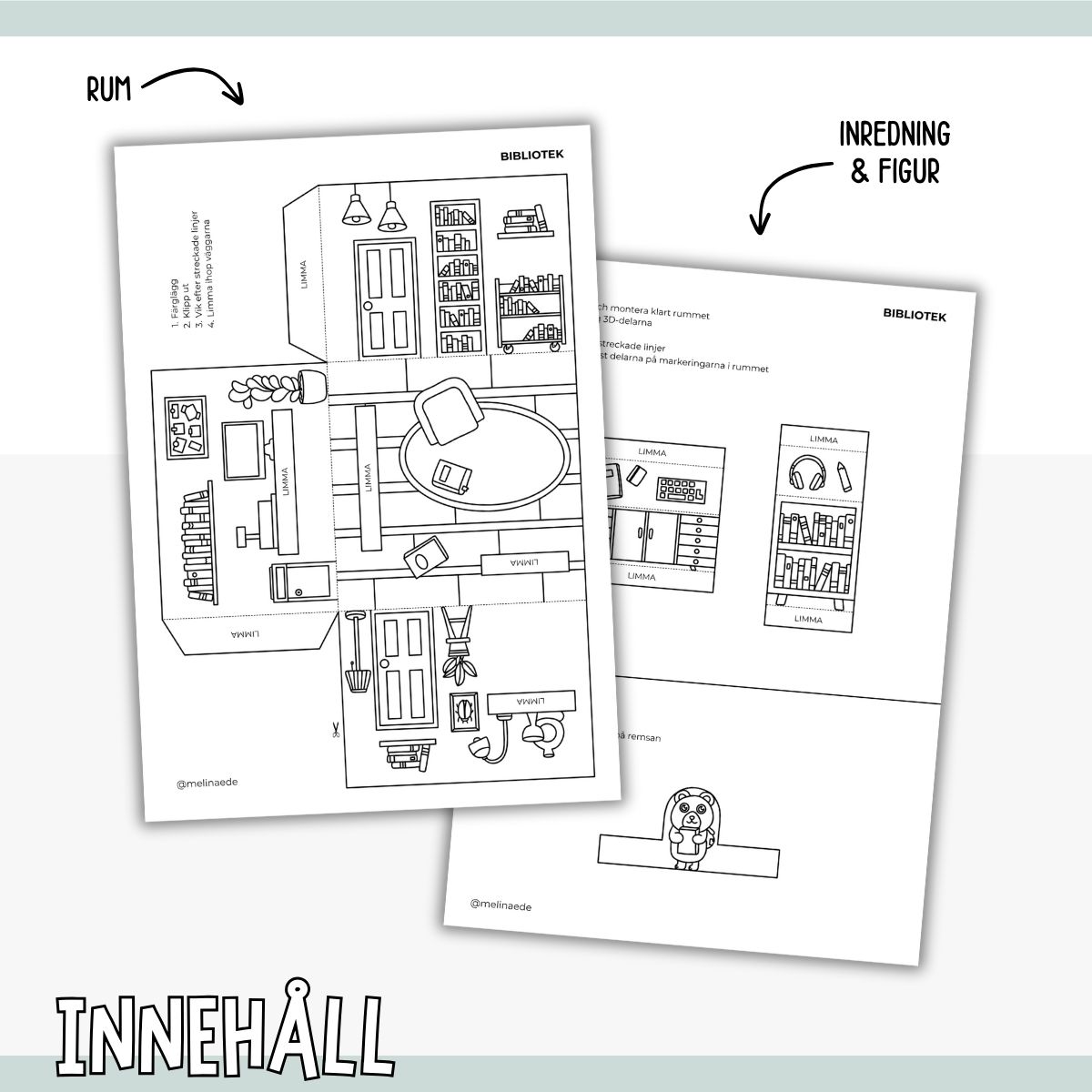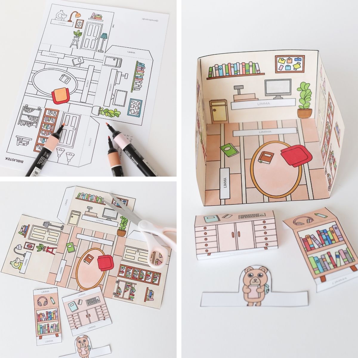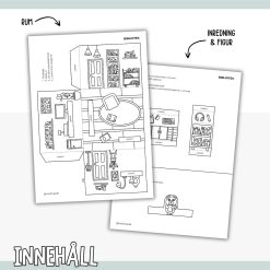 Pyssla ett dockhus i 3D. Färglägg, klipp ut och limma ihop. Alla rum i serien passar med varandra, bygg ut och mixa som du vill i ditt dockhus.