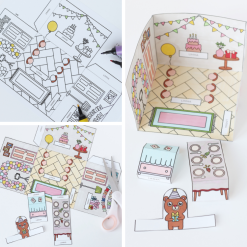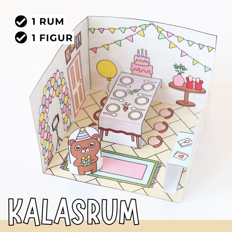Pyssla ett dockhus i 3D. Färglägg, klipp ut och limma ihop. Alla rum i serien passar med varandra, bygg ut och mixa som du vill i ditt dockhus.