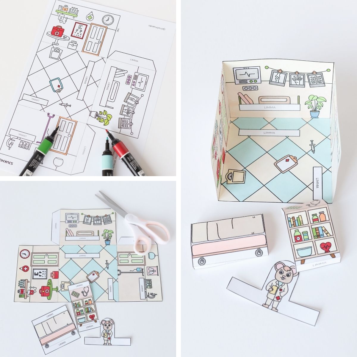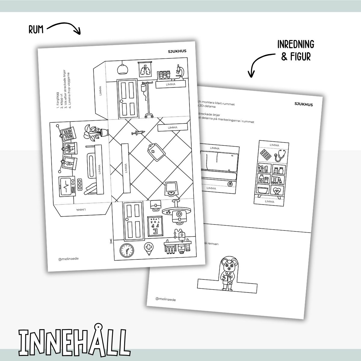 Pyssla ett dockhus i 3D. Färglägg, klipp ut och limma ihop. Alla rum i serien passar med varandra, bygg ut och mixa som du vill i ditt dockhus.