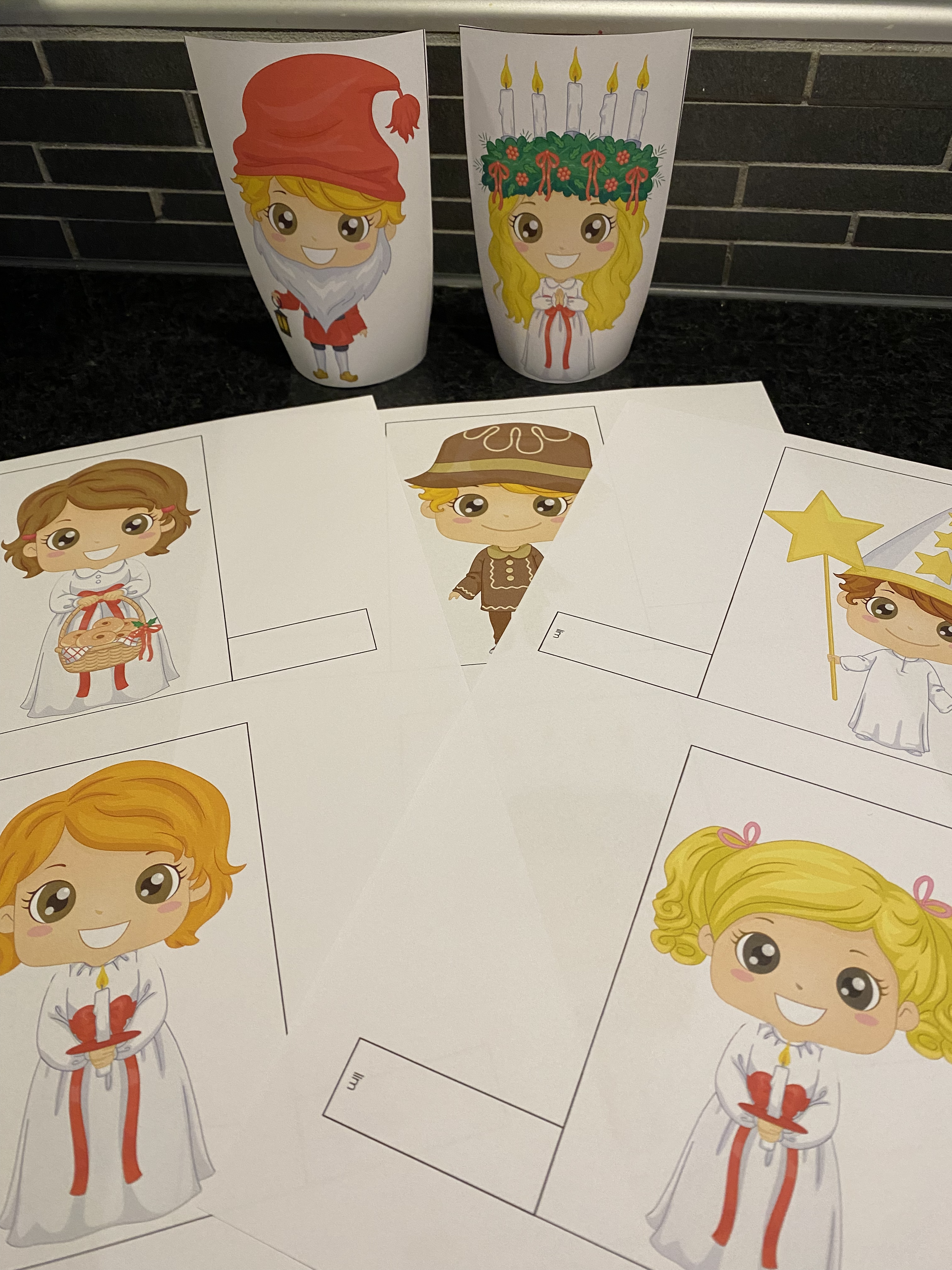 Lucia (2 olika), tärnor (3 olika), stjärngosse, pepparkaksgubbe och tomte.