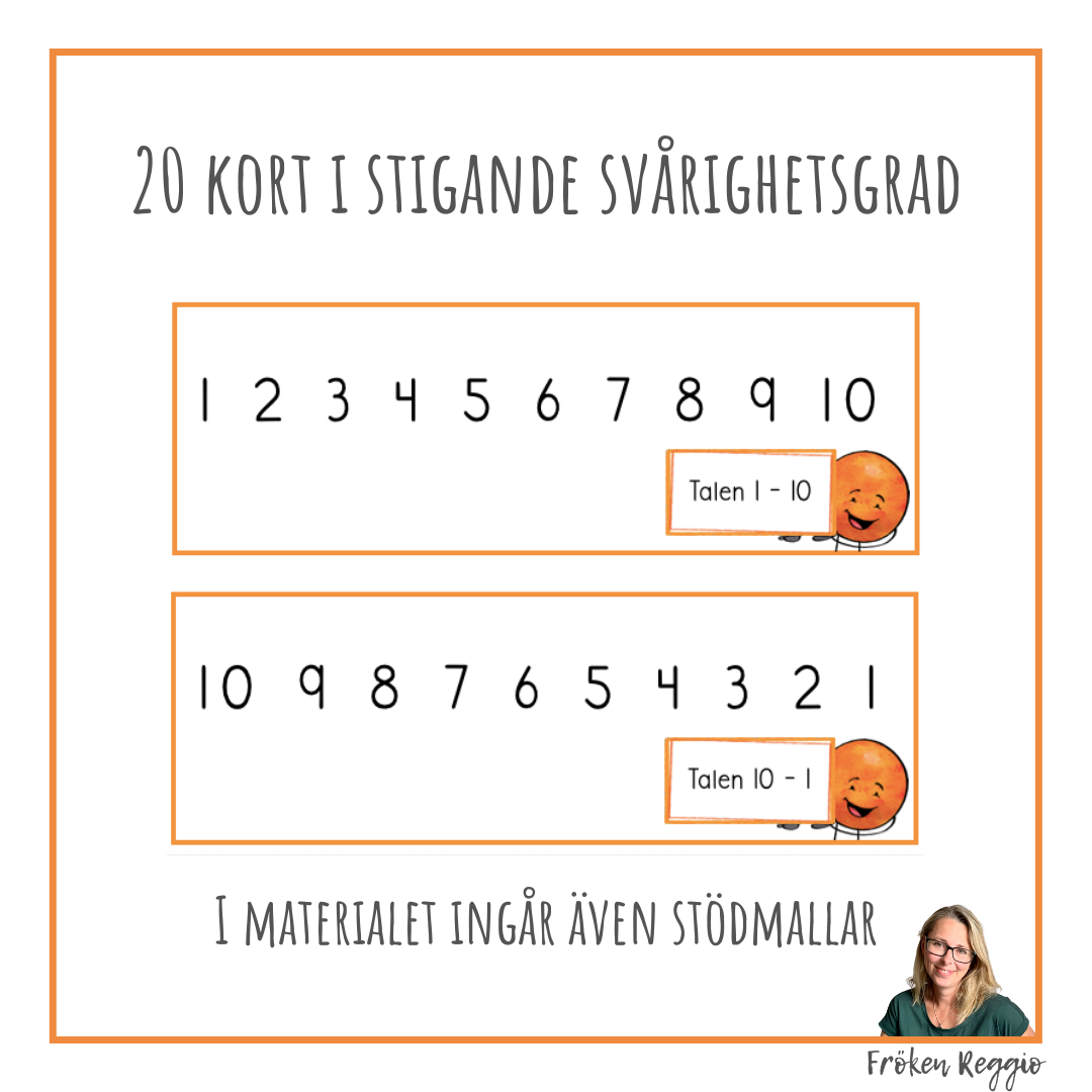 Träna på talraden från 1-10 och 10-1. 20 kort med ökande svårighetsgrad. I materialet ingår också stödmallar med talraden 1-10 och 10-1.
