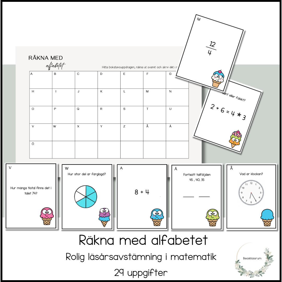 29 stycken matteuppgifter som ska placeras ut (a-ö finns på korten)