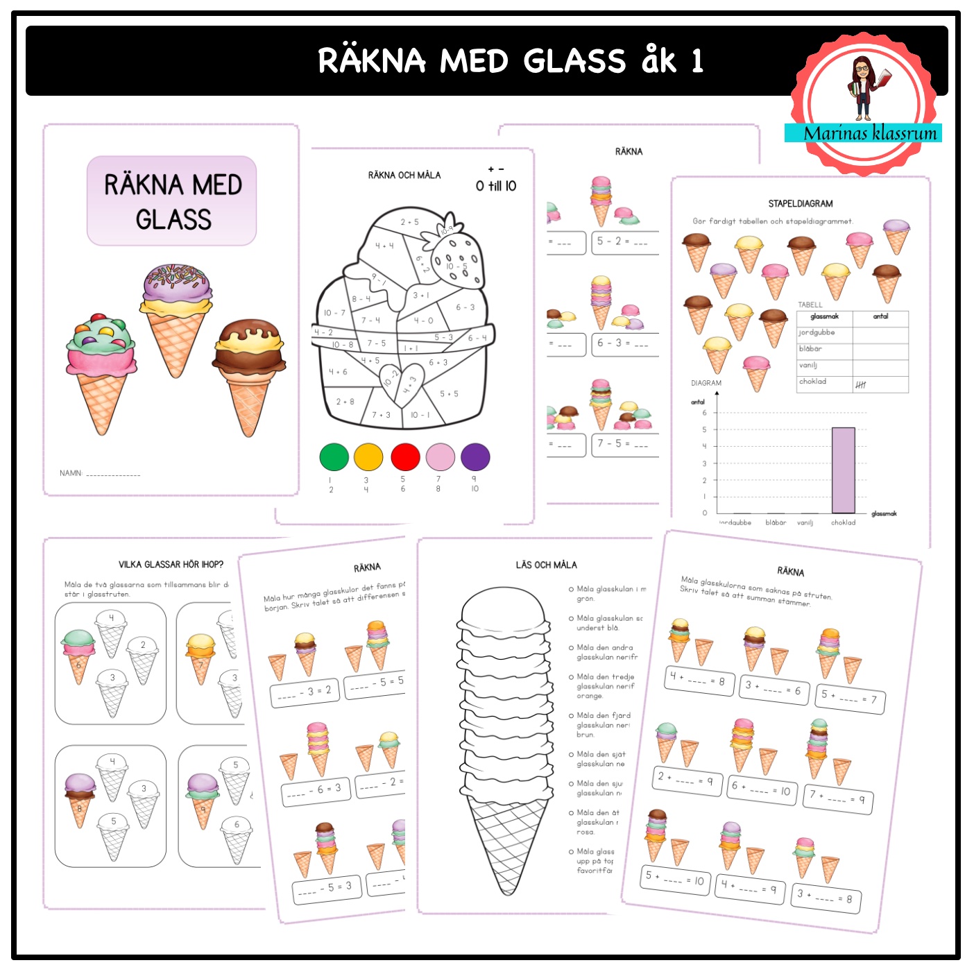 Räkna med glass är ett arbetshäfte med ett glasstema som tränar matematik för åk 1. Häftet har 10 sidor med olika övningar inom talområdet 0-10.