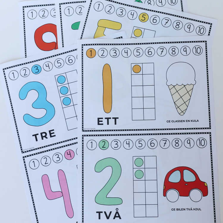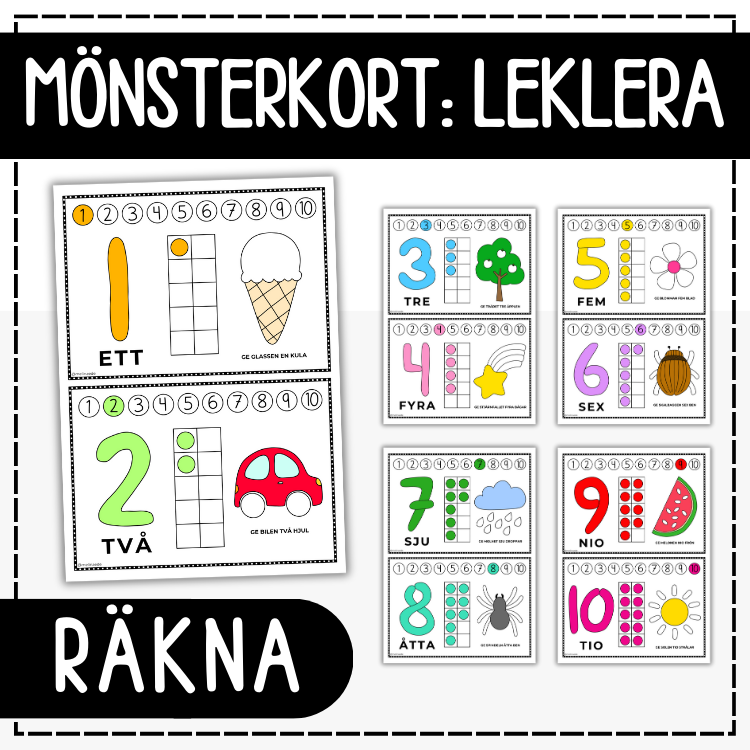 Träna på att räkna med lera. Innehåller kort med siffrorna 1-10. Forma siffran av deg och komplettera de tillhörande bilderna med rätt antal