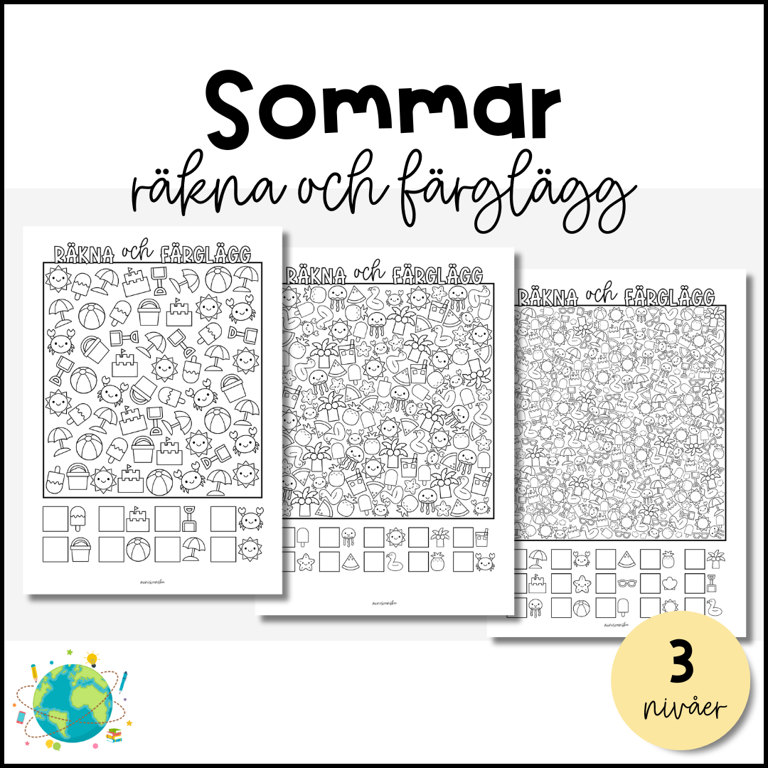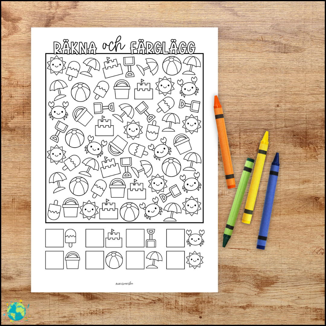 Eleverna väljer först färger och färglägger bilderna vid rutorna så de vet vilka färger de ska använda när de färglägger i den stora rutan. Därefter räknar de hur många det finns i den stora rutan och skriver svaren i de små rutorna.
