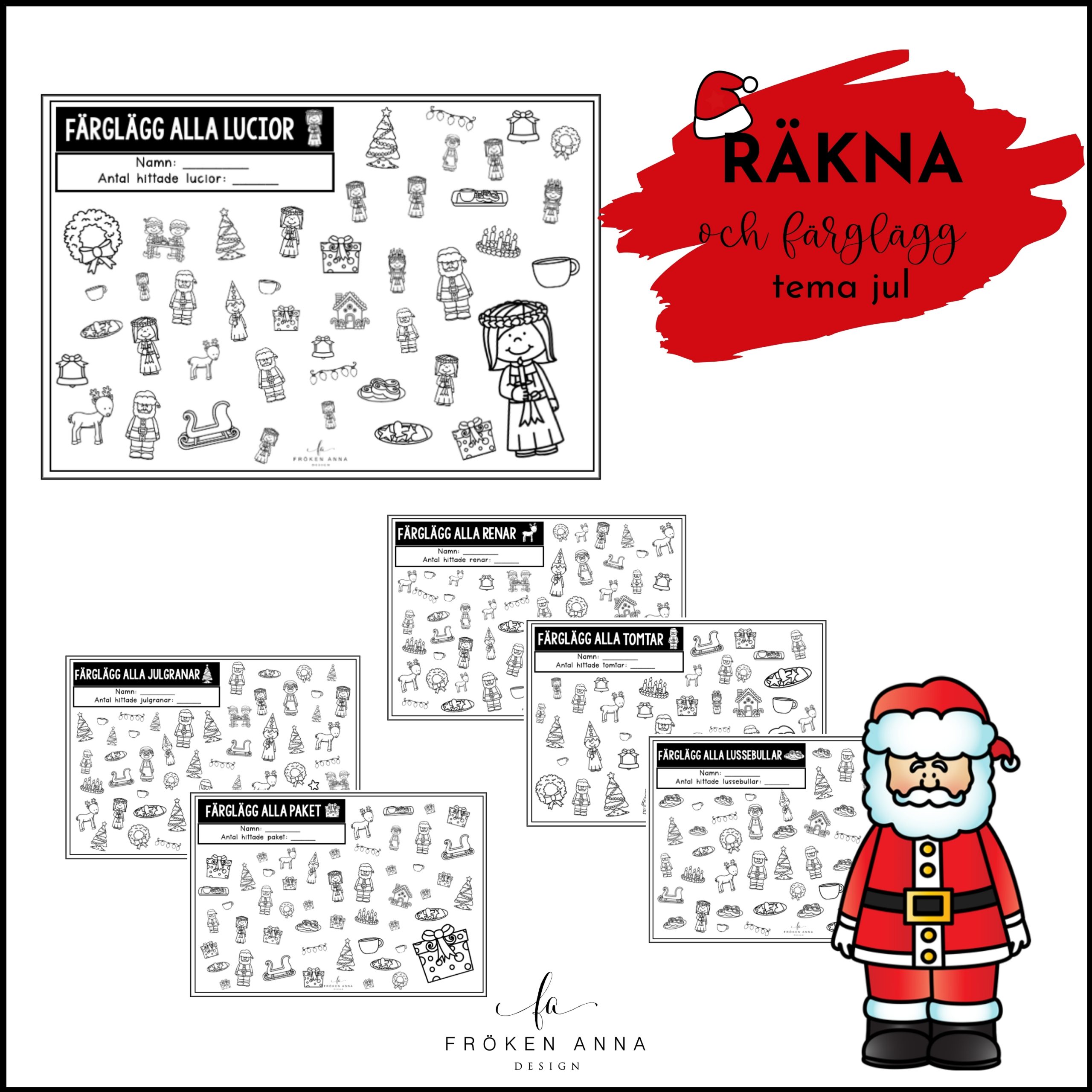 I detta material får eleverna leta efter, räkna och färglägga olika julmotiv. Totalt ingår 6 olika arbetsblad. Använd som morgonuppgift, extrauppgift, matteuppgift eller kanske som ”jag är klar – uppgift” i samband med julen 🙂