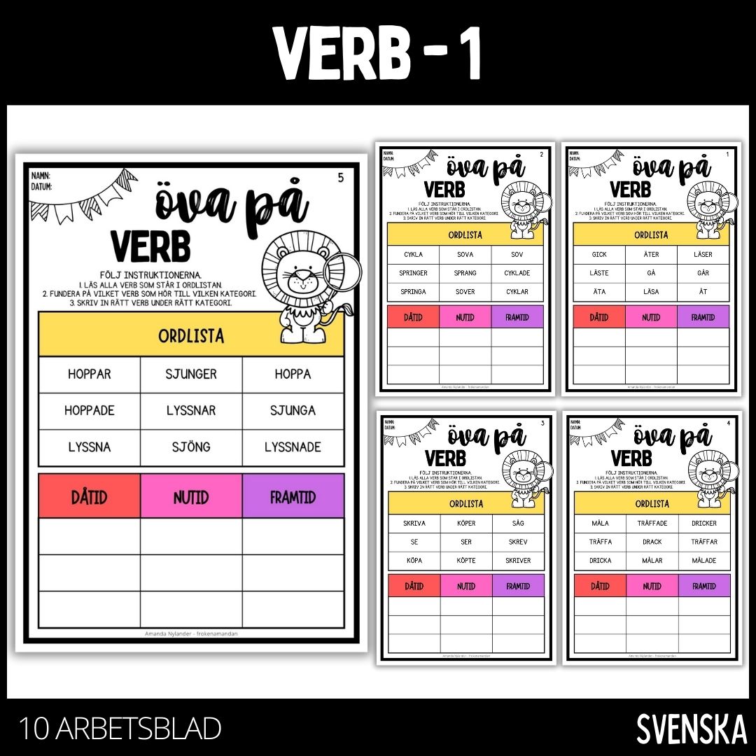 Öva på ordklassen verb med hjälp av dessa arbetsblad. Materialpaketet innehåller 10 st arbetsblad. Varje arbetsblad innehåller 9 olika verb att öva ordklassen på samt ett lejon att färglägga om tid finns över. Låt eleverna jobba enskilt, i par eller i grupp.