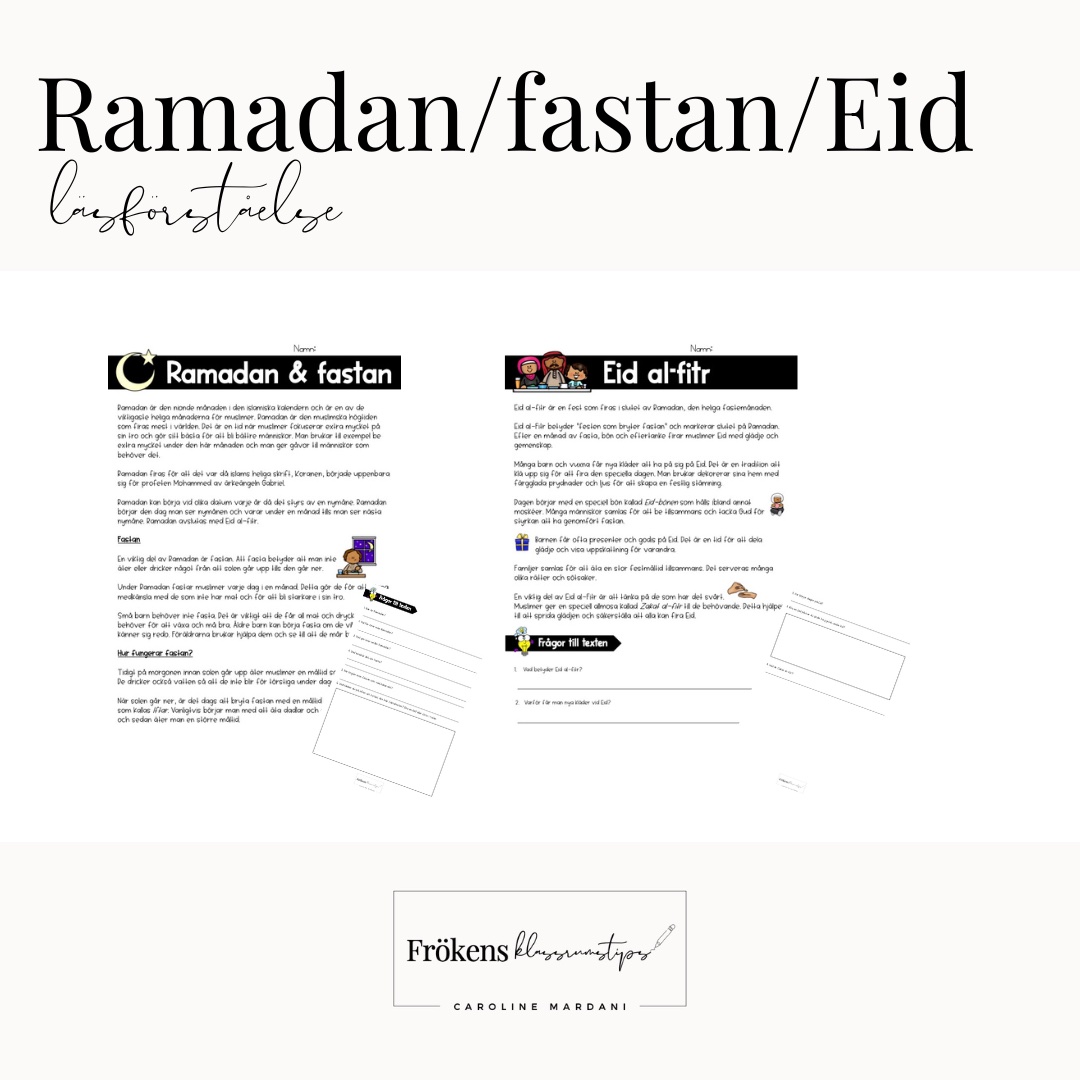 Två olika läsförståelsetexter som kan användas när man arbetar med ämnet religion eller om man uppmärksammar högtiden Ramadan.