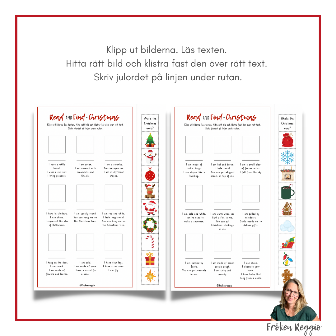 Läs ledtrådarna och para ihop med rätt bild. Skriv sedan namnet på julordet på engelska.