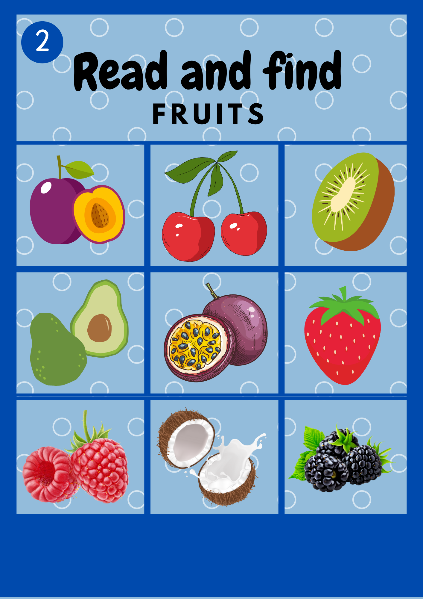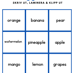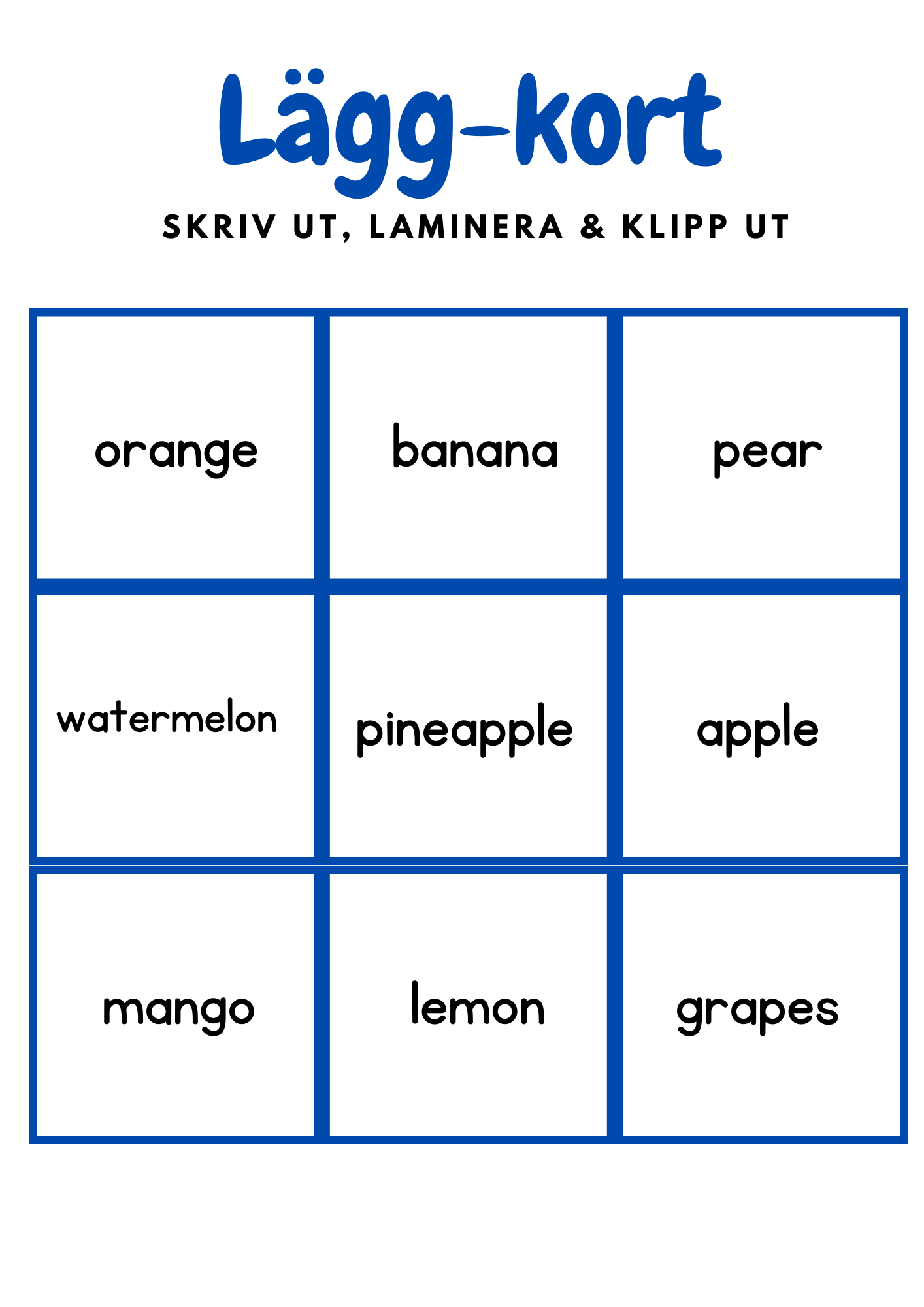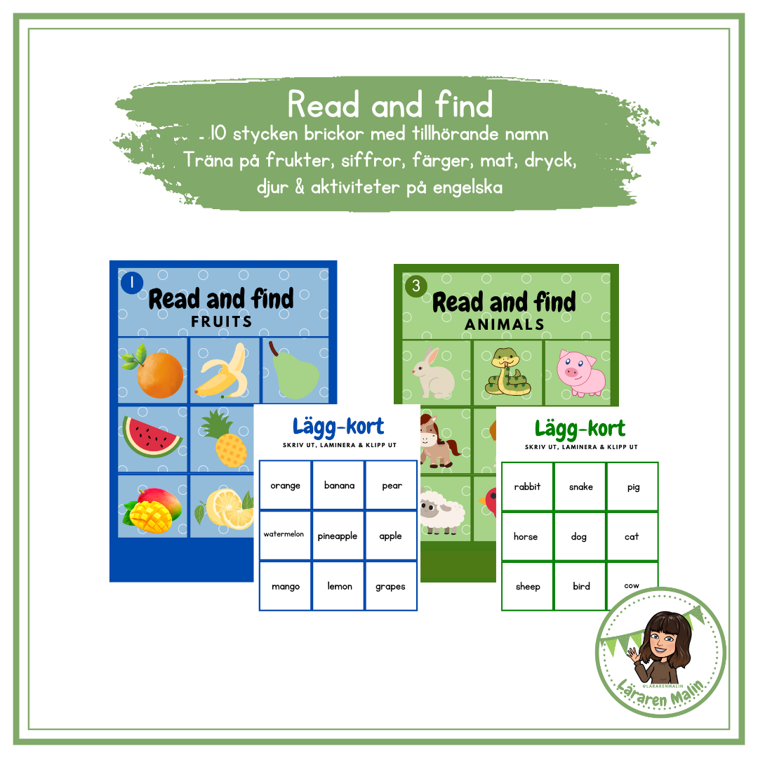Read & find. Läs och lägg med engelska ord. Innehåller totalt 10 olika brickor med tillhörande namn som du klipper ut. 2 med frukter, 1 med siffror, 1 med färger, 2 med djur, 1 med saker du kan äta, 1 med saker du kan dricka samt 2 med aktiviteter.