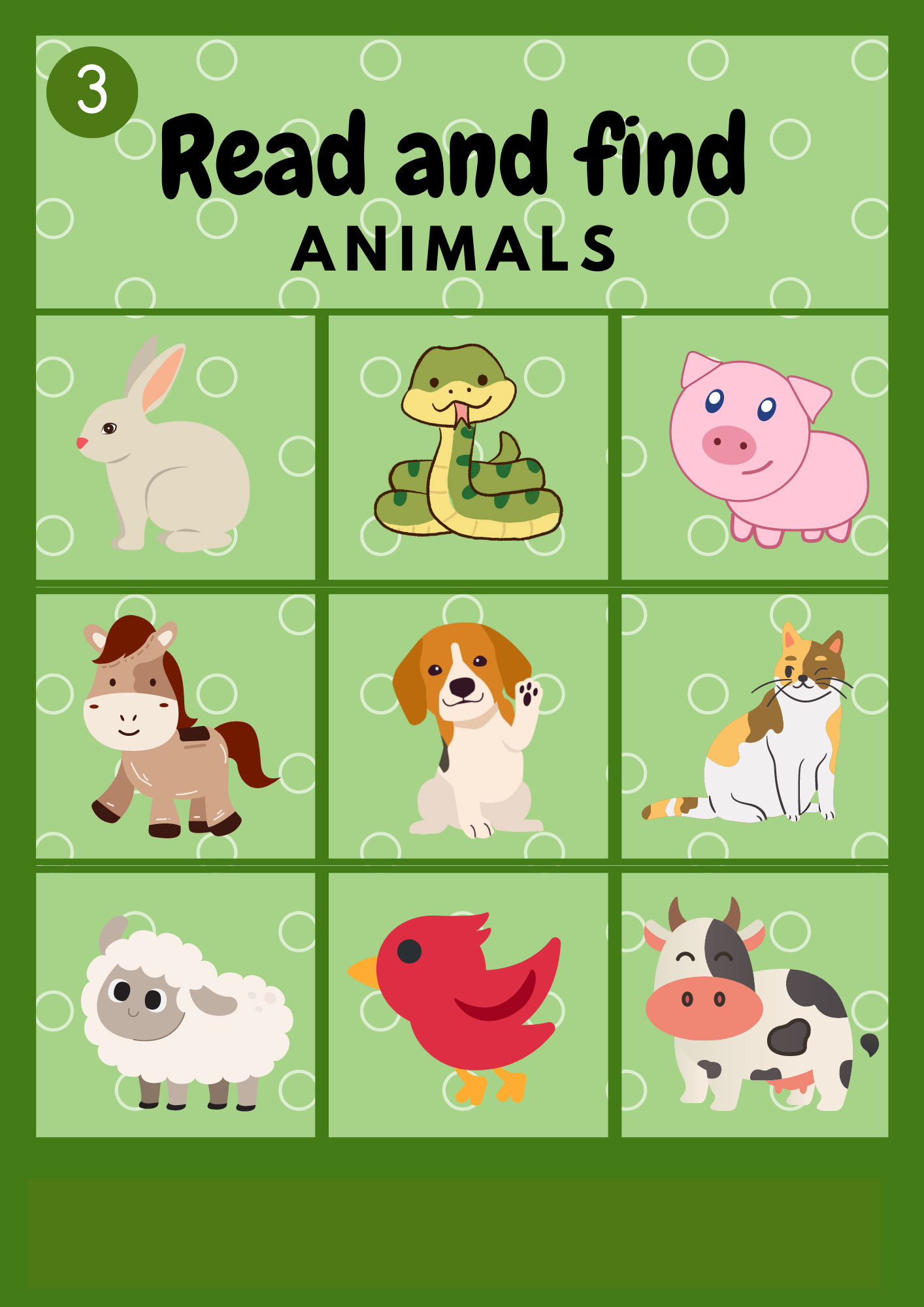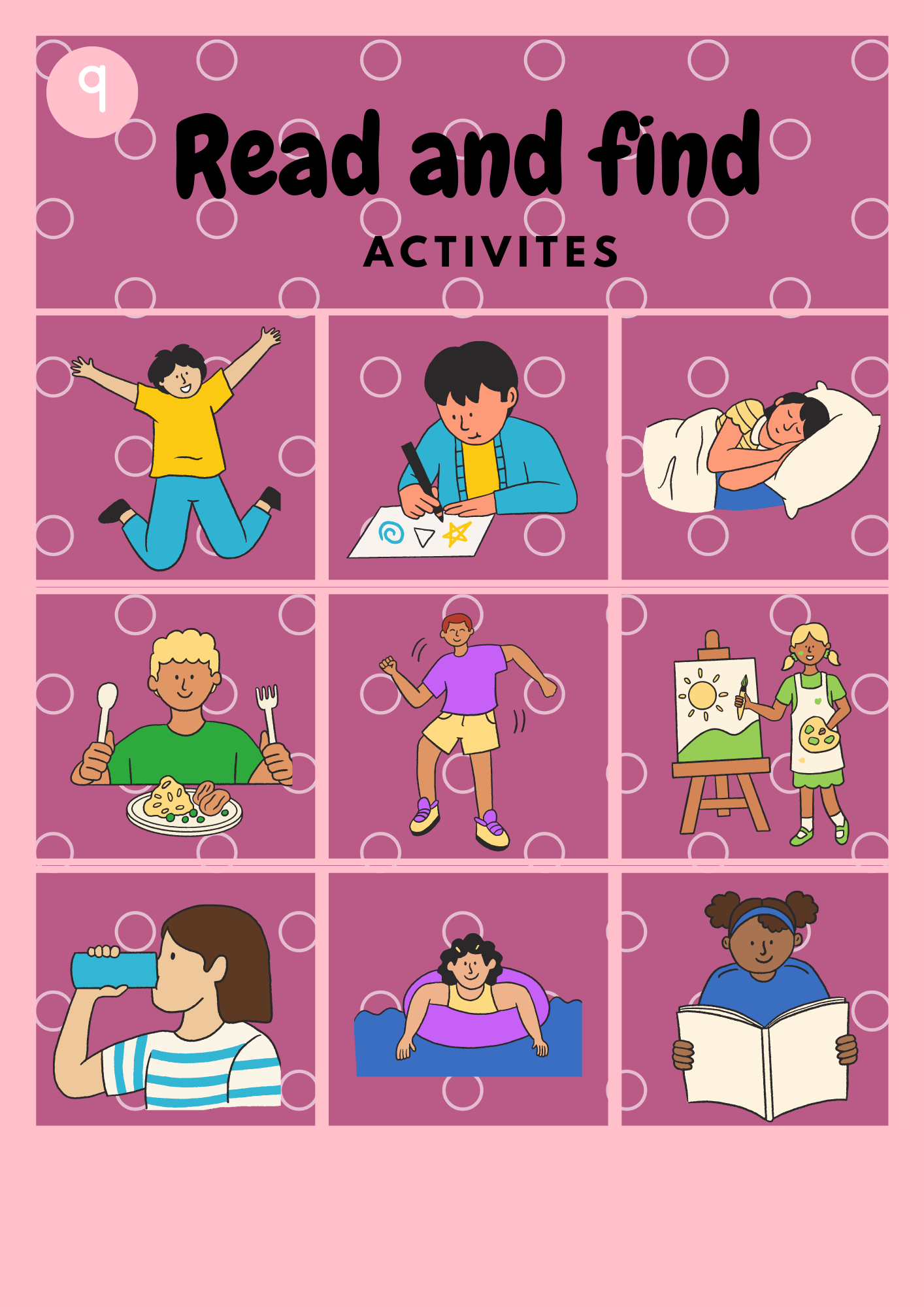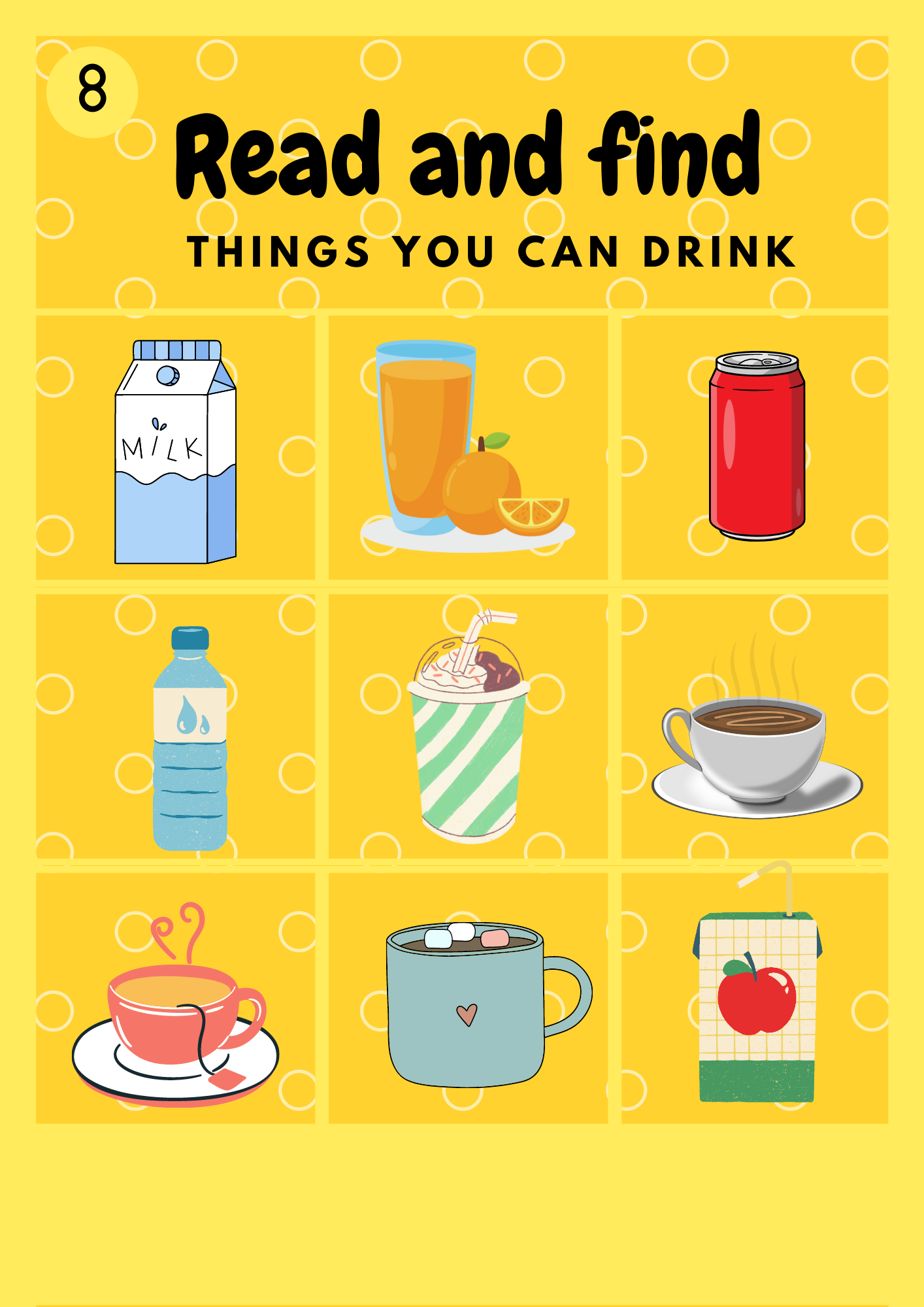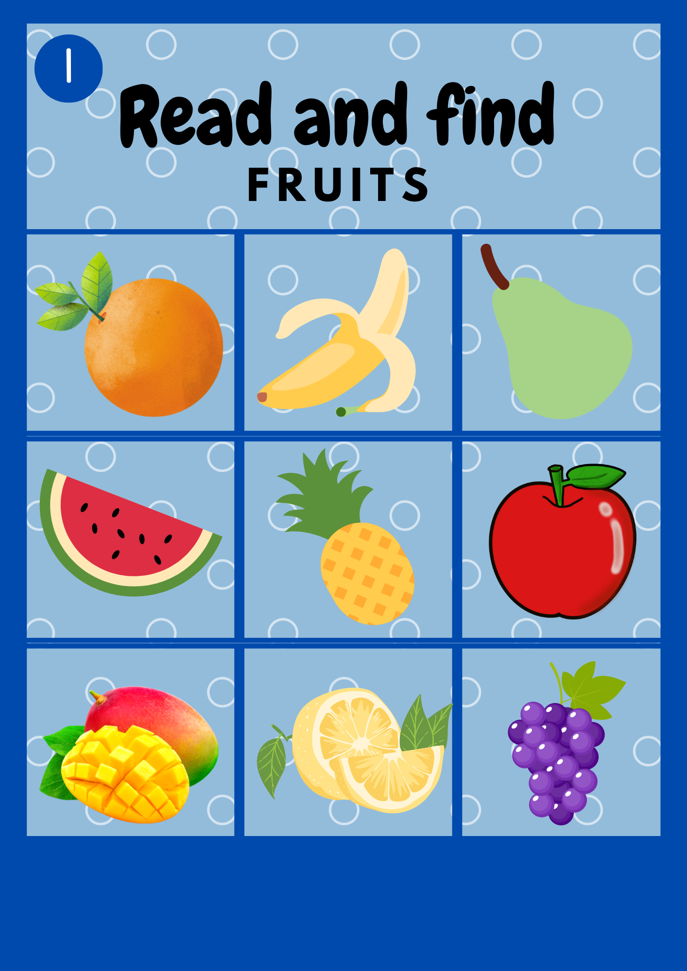 Read & find. Läs och lägg med engelska ord. Innehåller totalt 10 olika brickor med tillhörande namn som du klipper ut. 2 med frukter, 1 med siffror, 1 med färger, 2 med djur, 1 med saker du kan äta, 1 med saker du kan dricka samt 2 med aktiviteter.