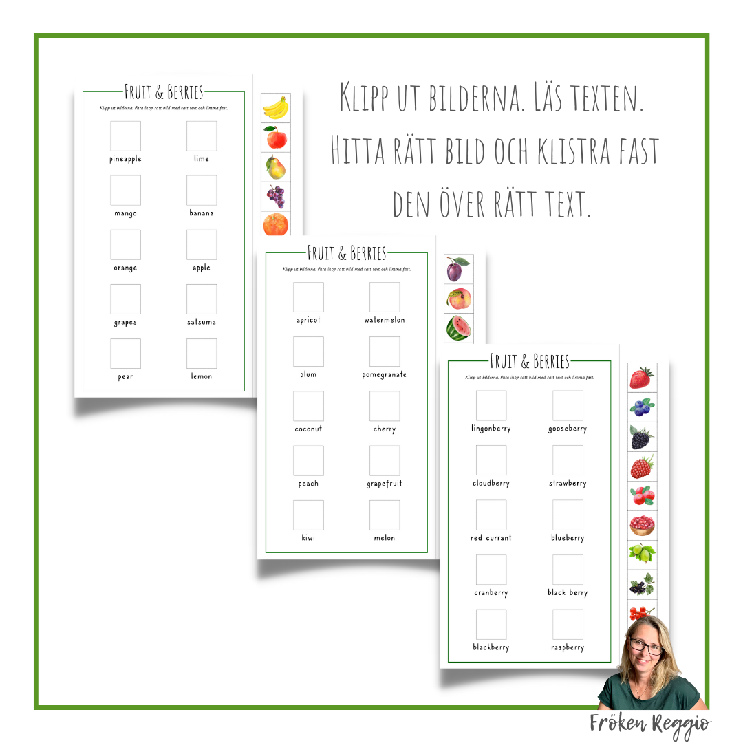 Se även mitt material ”Find my match – Fruit & Berries” där samma frukter och bär finns fast i kortform samt ”Fruit & Berries crossword puzzle” och ”Word Search – Fruit & Berries”.