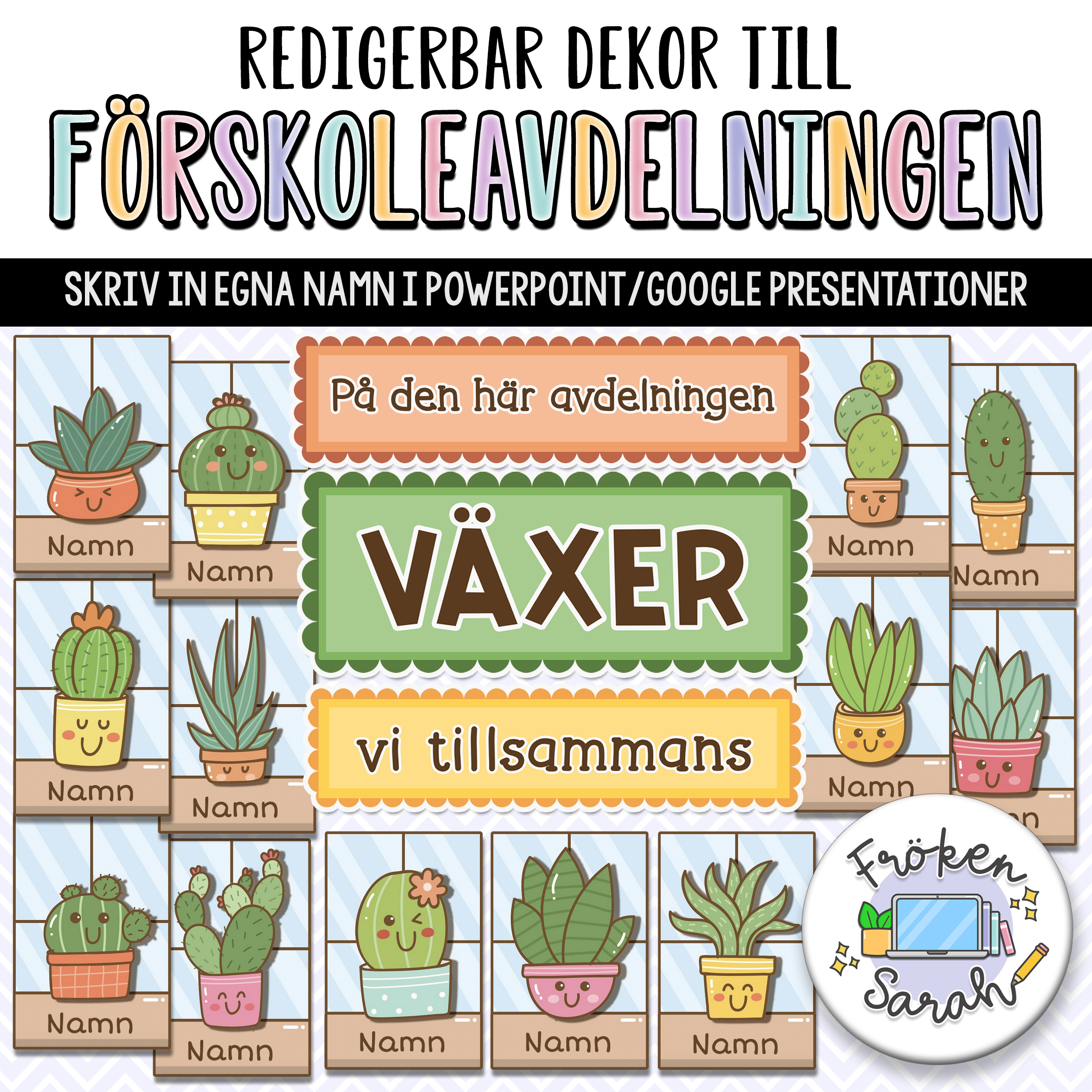 Det ingår 16 olika växter/kaktusar. Man kan låta barnen själva välja vilken växt/kaktus de vill ha till sitt namn, och om det är flera som väljer samma så kan man duplicera sidan som växten är på och skriva in fler namn i kopian.