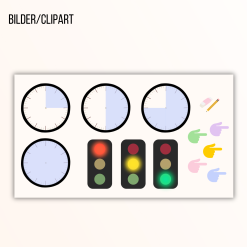 - Bilder/clipart att använda på: trafikljus som lyser rött, gult och grönt, händer som pekar, timers som visar 15, 30, 45 och 60 minuter, samt penna och sudd.