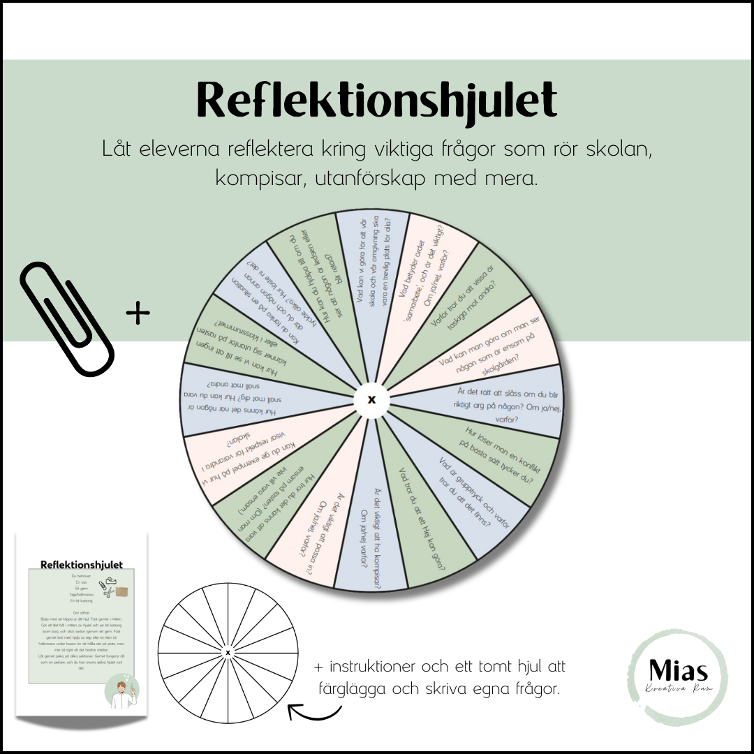 Instruktioner kommer med materialet + ett tomt hjul för att skriva egna reflektionsfrÄgor.