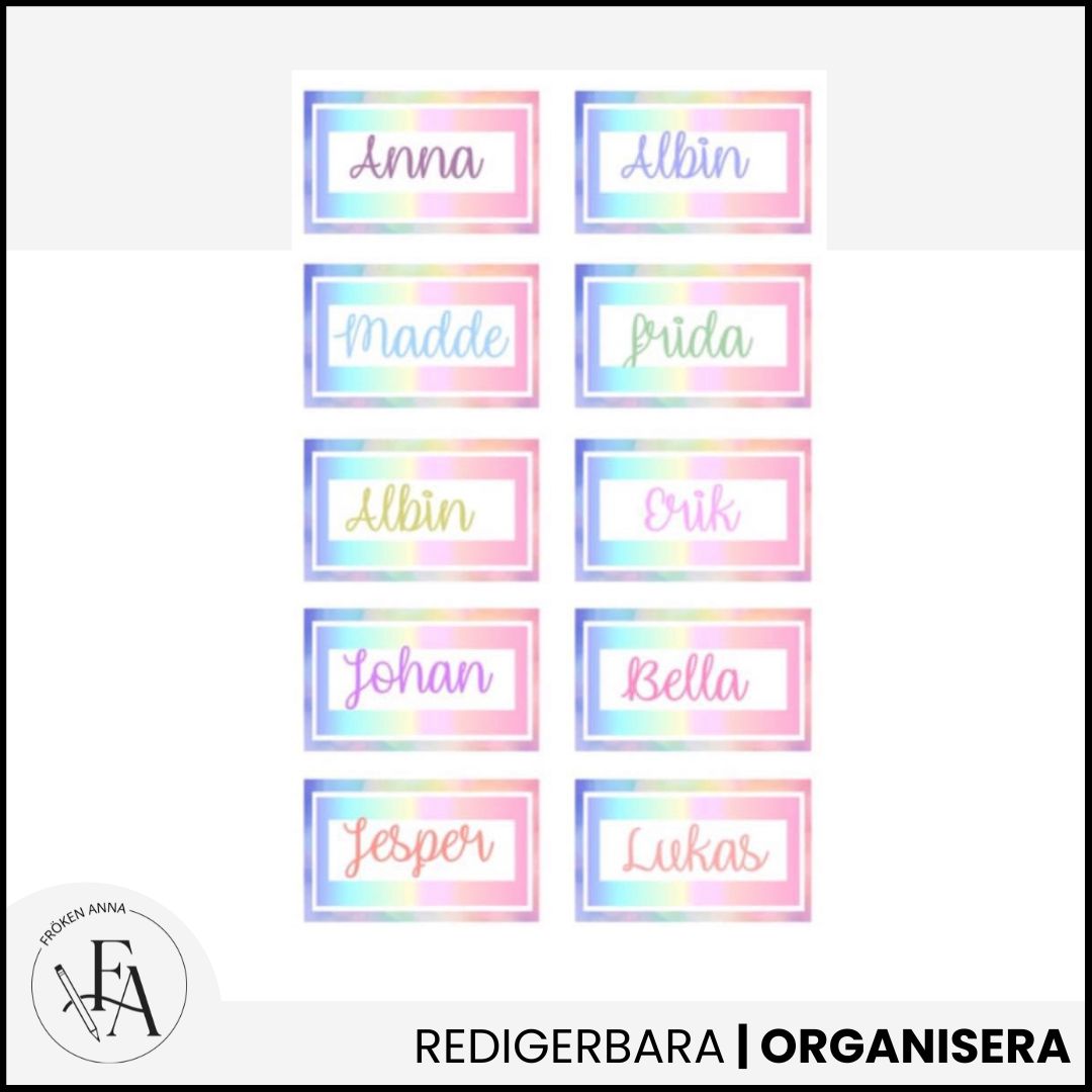 Regnbågsfärgade, redigerbara namnskyltar till elevens bänkar, lådor eller skåp. Levereras i formatet Word.