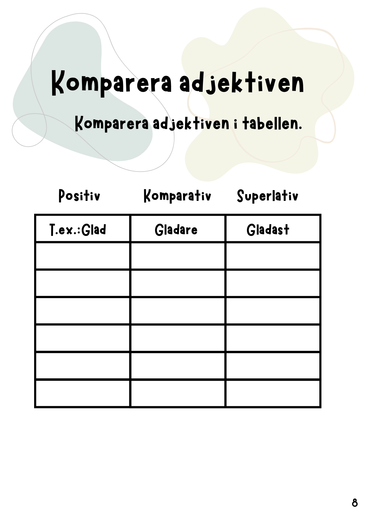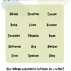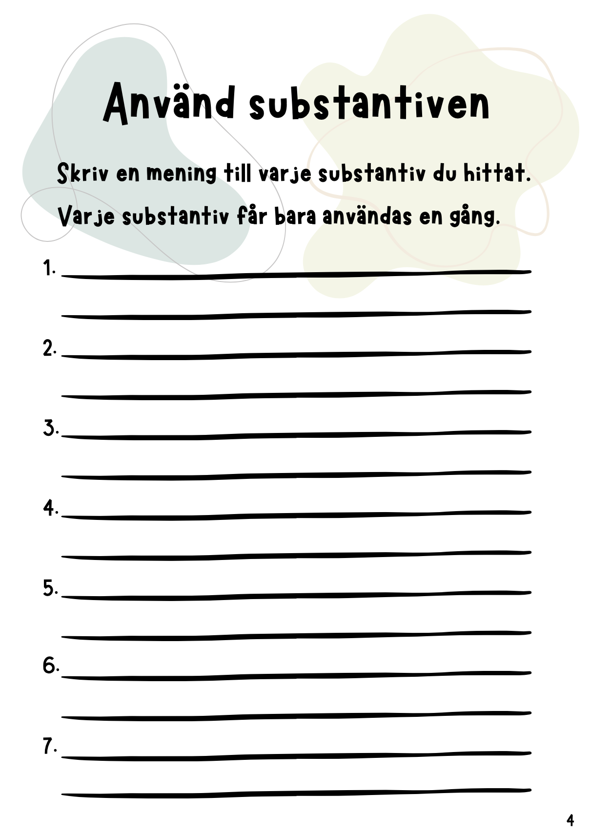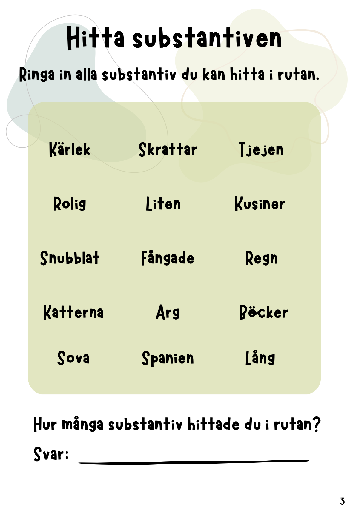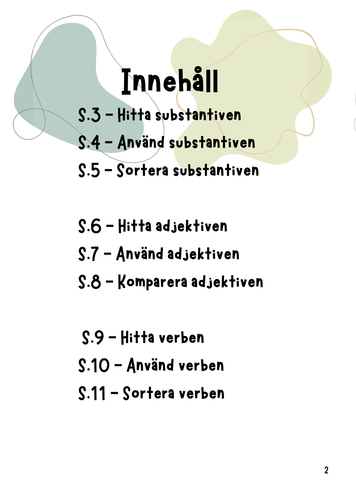 Ett häfte som låter eleverna öva på grunderna inom substantiv, adjektiv och verb. Varje ordklass innehåller 3 sidor med följande övningar: