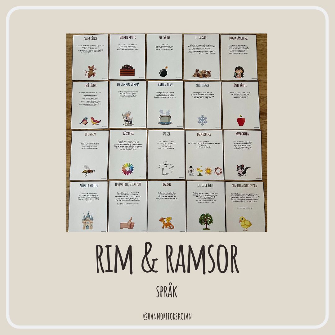 Rim & ramsor – det här materialet ger er en härligt stund tillsammans med barnen. Hos oss tar vi fram alla korten och låter ett barn i taget välja en ramsa. Materialet består av 31 kort.
