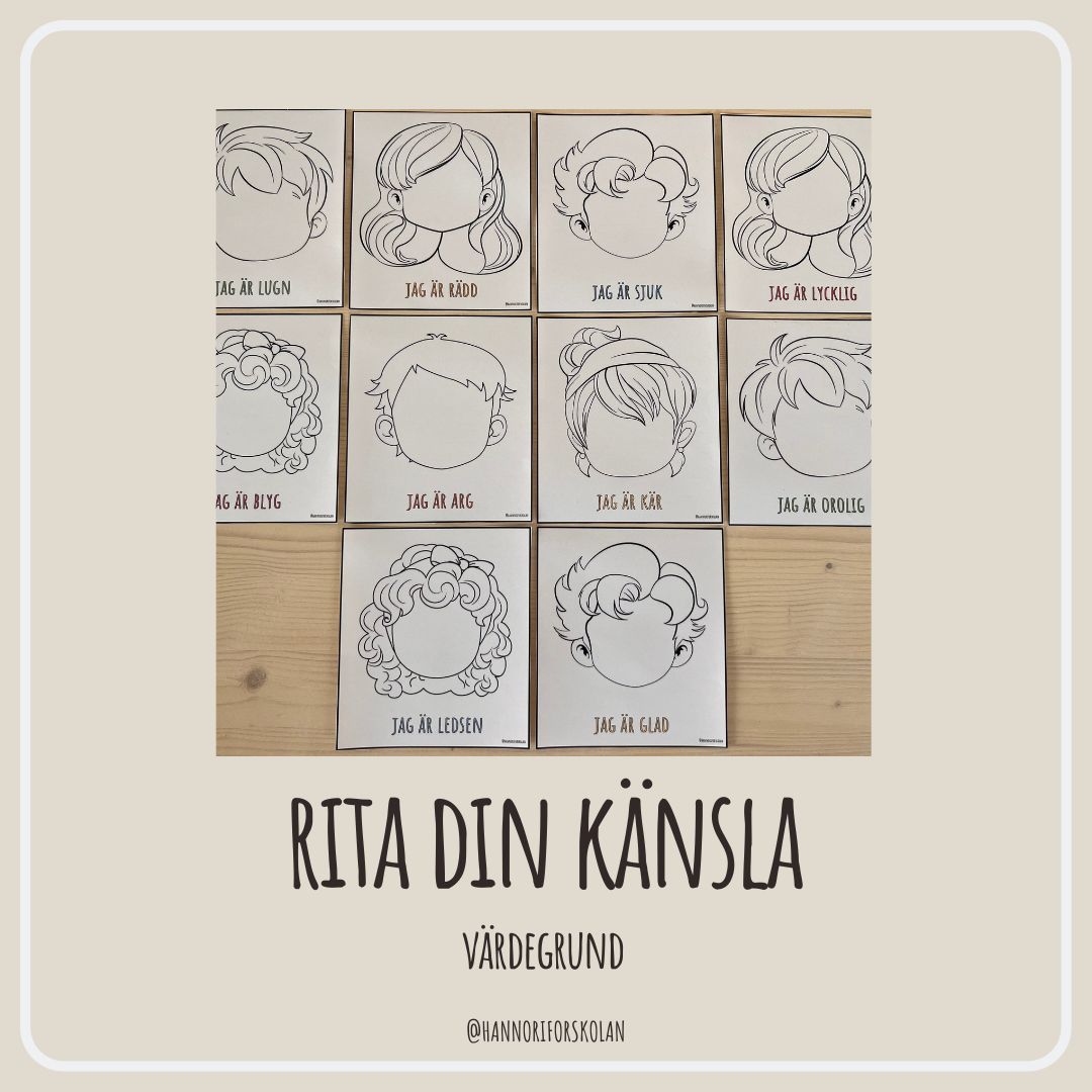 Rita din känsla – det här materialet använder vi när vi pratar om känslor med barnen. Efter varje känsla erbjuder vi barnen att måla hur känslan känns / ser ut.