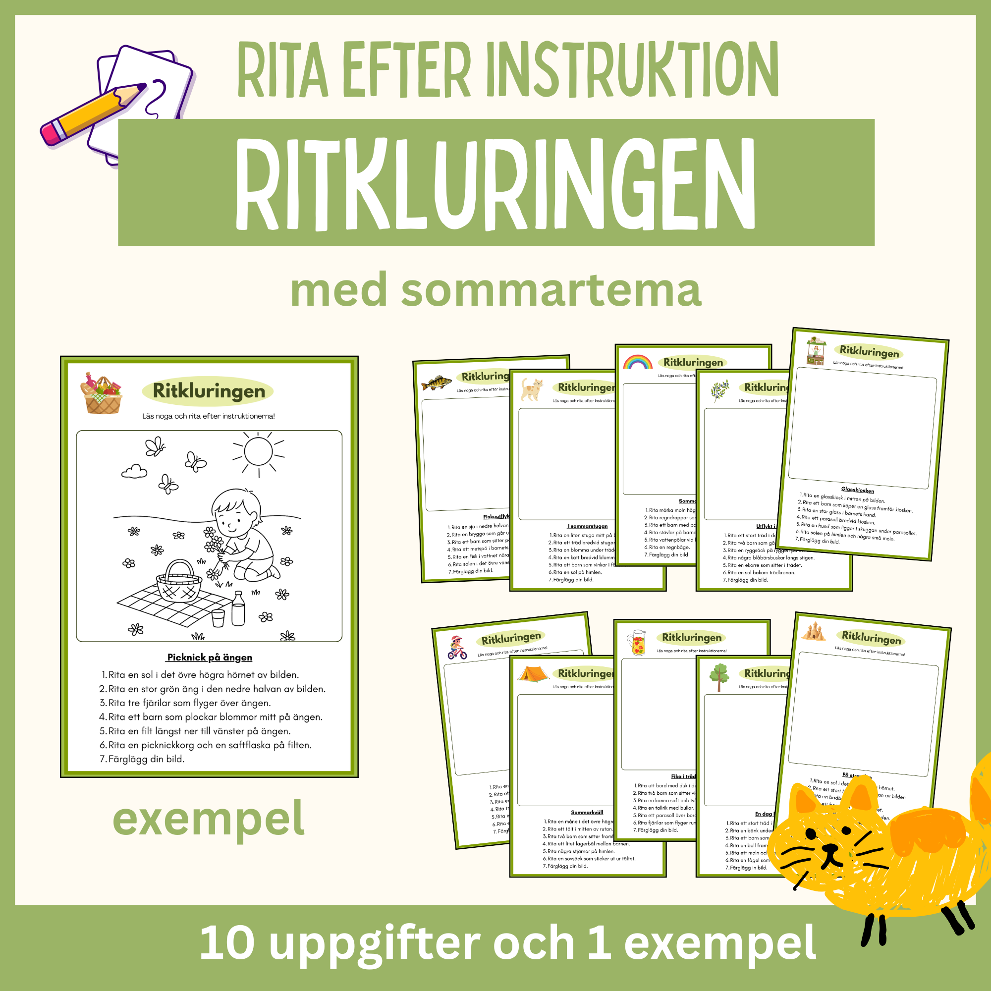 Rita efter instruktion – enkel läsförståelse med sommartema, 10 arbetsblad och 1 exempel
