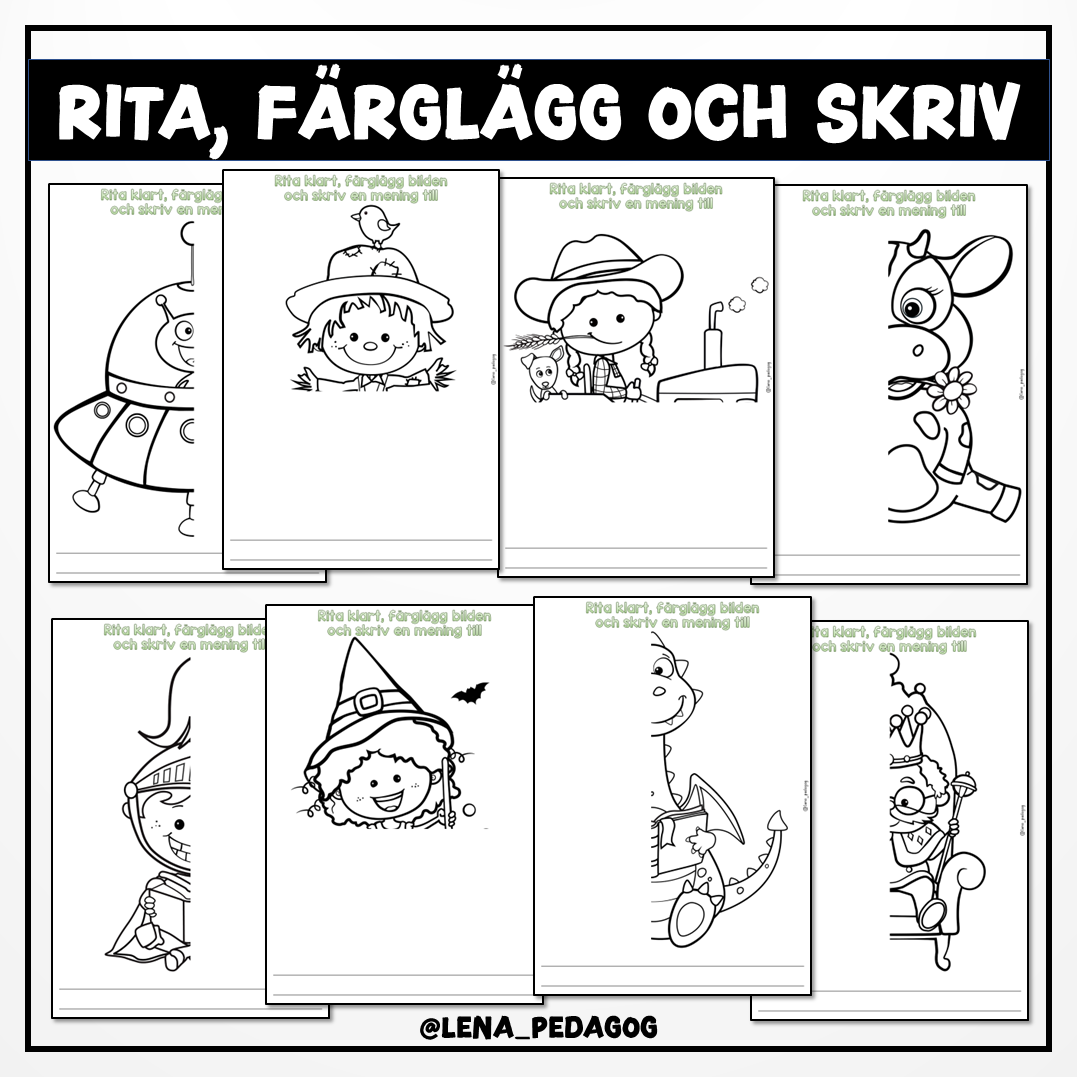 40 sidor med halverade bilder (lodrätt och vågrätt) att rita klart och färglägga. Skriv sedan en passande mening till bilden.