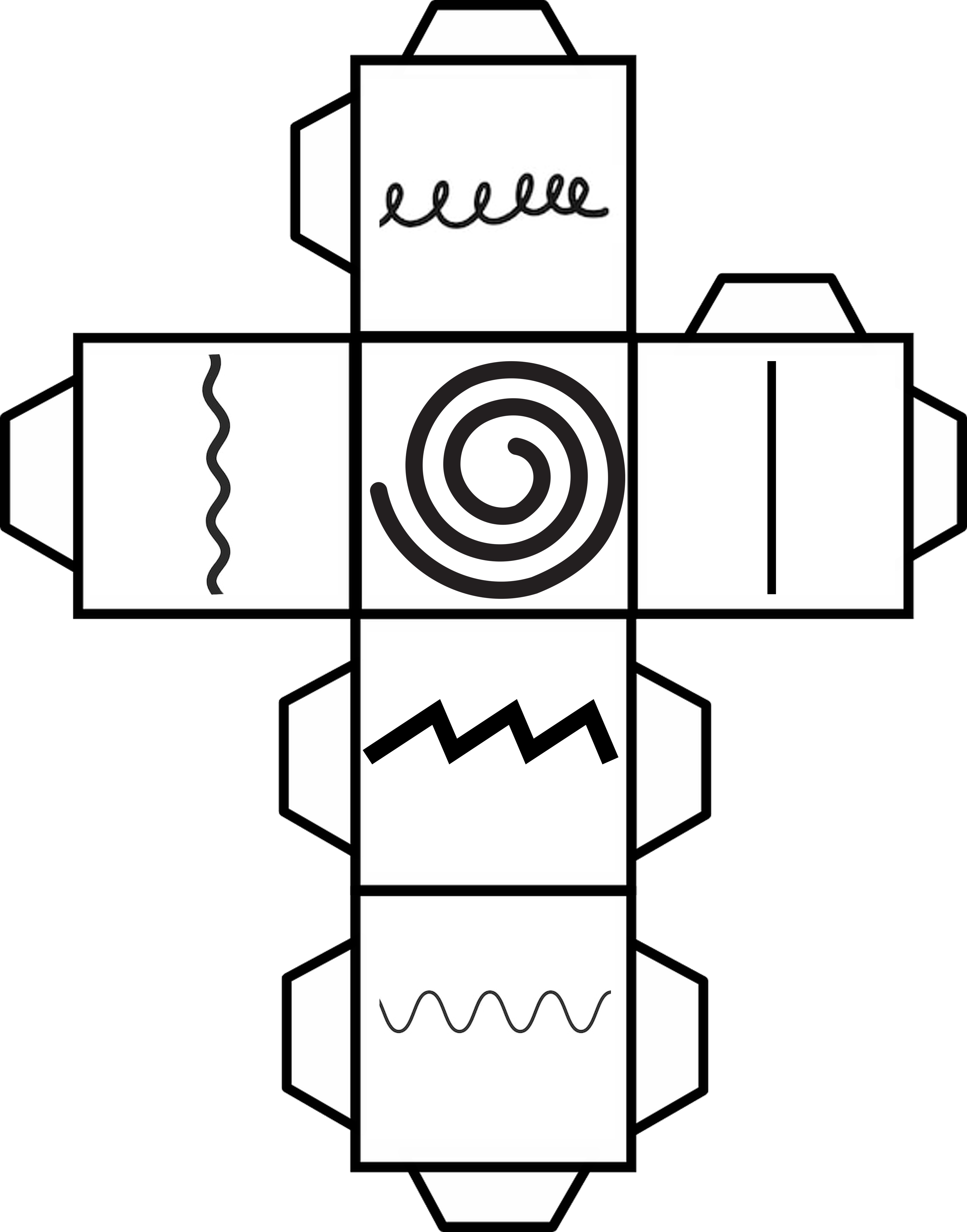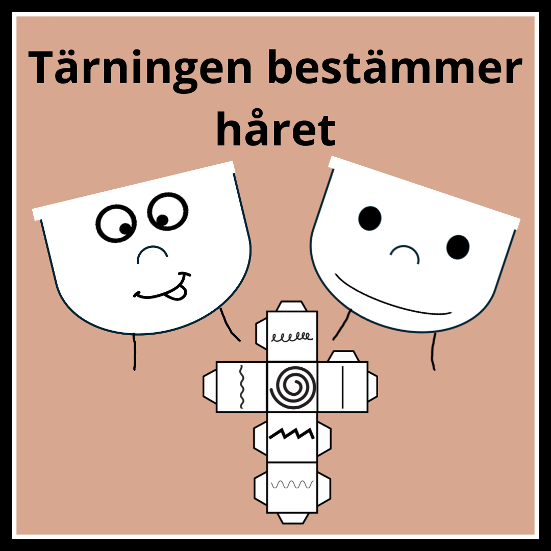 Materialet är förberedande skrivövning. Här ska barnet slå tärningen och sedan rita håret i den form som tärningen visar. Man kan ha det som en enskild övning eller så kan man göra det som ett spel. Om man laminerar ansikten så kan man använda dem om och om igen om man ritar med en penna som man kan sudda.