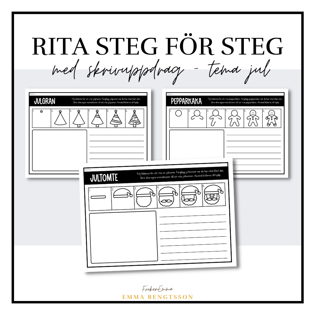 Materialet innehåller tio arbetsblad i två olika utföranden.I den ena uppgiften ska eleven först rita en julfigur enligt instruktion och därefter skriva egna instruktioner till att rita figuren. I den andra uppgiften ska eleven rita en julfigur enligt instruktion och sedan finns de möjlighet att bestämma skrivuppgift till bilden själv vilket till exempel kan vara att skriva en beskrivning av bilden eller en kort berättelse.