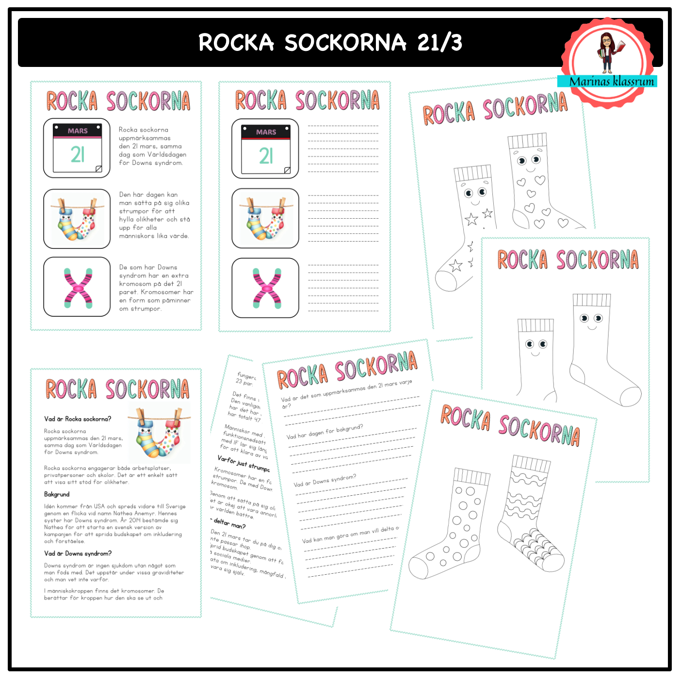 Den 21 mars rockar vi sockorna, men varför? Läs och skriv ett eget faktablad om dagen. Läs och fördjupa dig i bakgrunden till den här dagen och svara på läsförståelsefrågor. Släpp lös din fantasi och kreativitet och måla dina egna sockor i olika färger och mönster med hjälp av målarbilderna som följer med materialet.