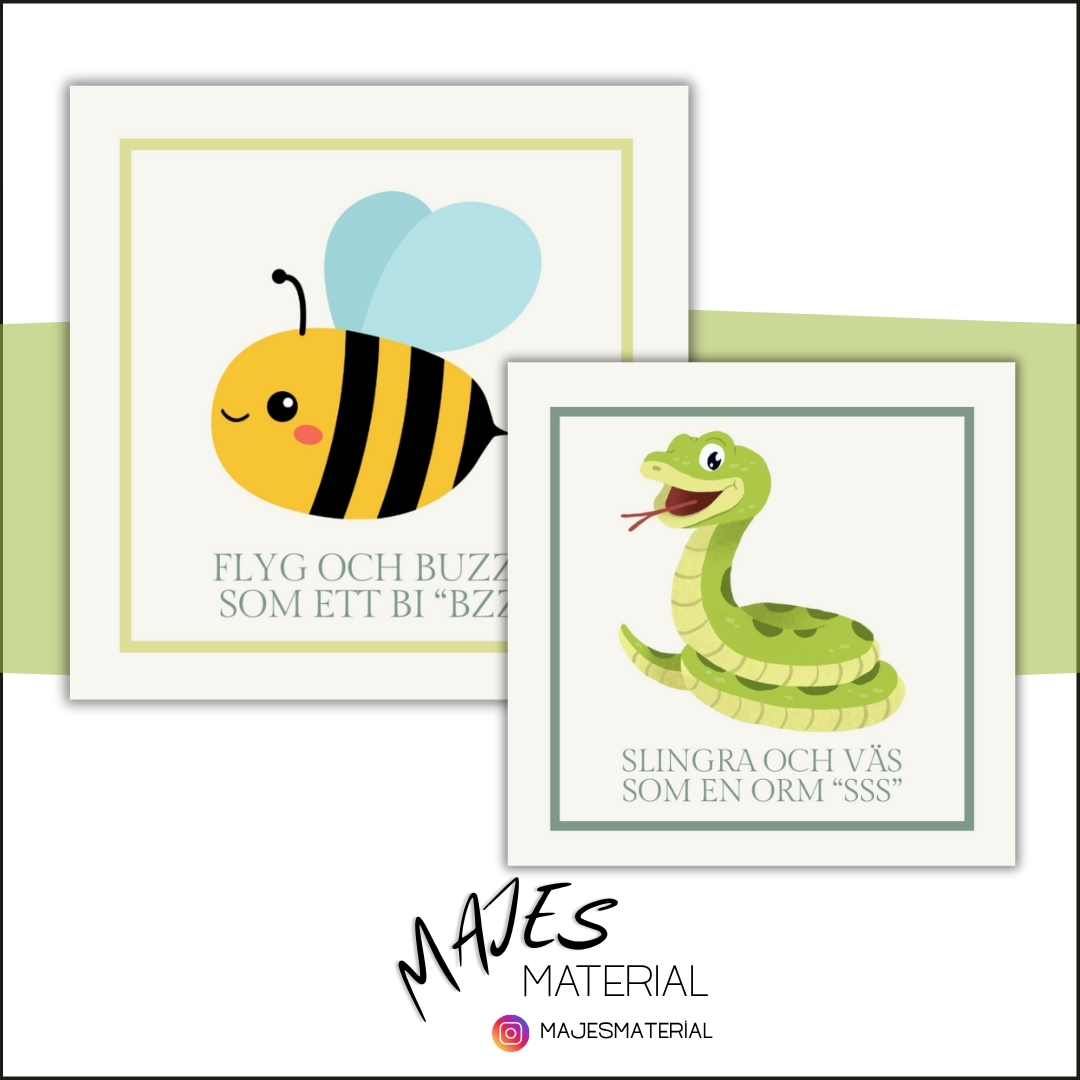 Med dessa kort övar vi både rörelse och språkljud. (Sex olika bilder med olika rörelser/ljud).