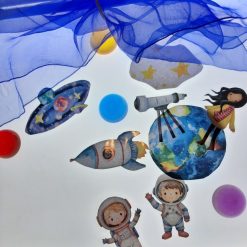 4 blad med bilder som passar till sagan, Rymdäventyret. Som kan användas på ljusbordet.