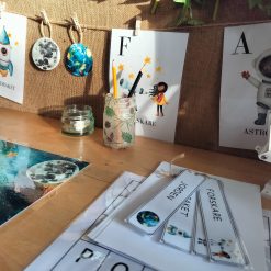 1 blad med begrepp som barnen/eleverna kan skriva med fokus på rymden. Finns bild på begreppen som stöd.