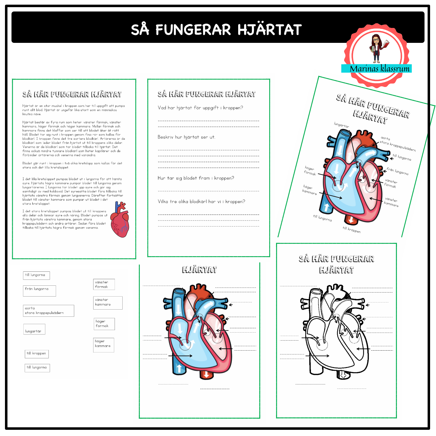Lär dig hur hjärtat fungera. Materialet består av: en faktatext med frågor till, bild att fylla i namn på hjärtats olika delar antingen genom att skriva på linjerna eller genom att klippa ut textrutorna och limma dem på rätt plats.