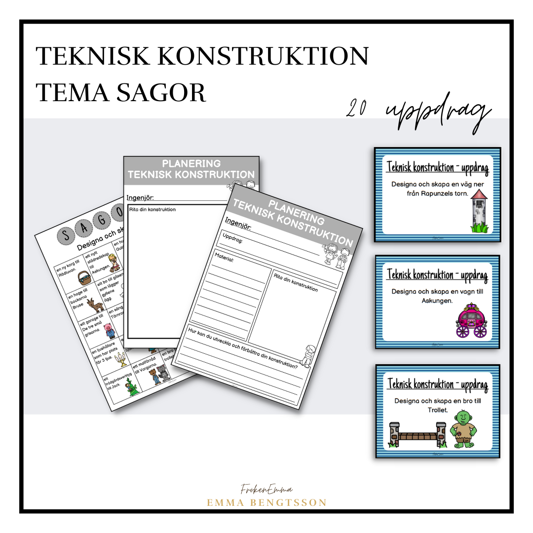 Arbeta med sagor och teknik samtidigt! Detta passar bra just under temat sagor / berättande text. Materialet innehåller 20 olika uppdrag om tekniska konstruktioner att dela ut till eleverna eller låta eleverna välja mellan. Uppdragen finns samlade på en skylt samt på separata kort. Ett roligt och kreativt arbete. Låt eleverna bygga en väg ner från Rapunzels torn, en ny stol till Lilla björnen eller ett nytt städredskap till Askungen. Med uppdragen följer det även med fyra olika planeringsmallar på olika nivåer samt en checklista. Här sätter bara fantasin gränser.