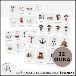 Materialet innehåller 32 bildkort med karaktärer, miljöer och viktiga attribut – perfekta för muntligt berättande, skrivande och lekfullt sagoskapande.