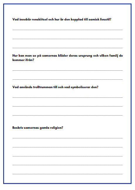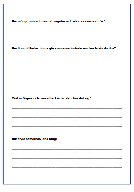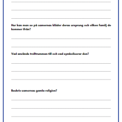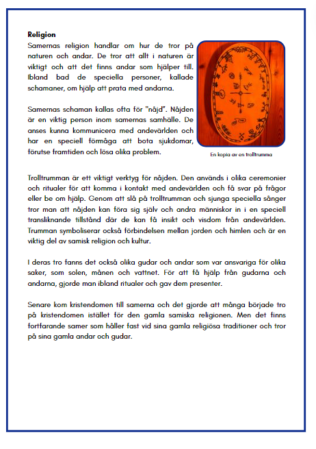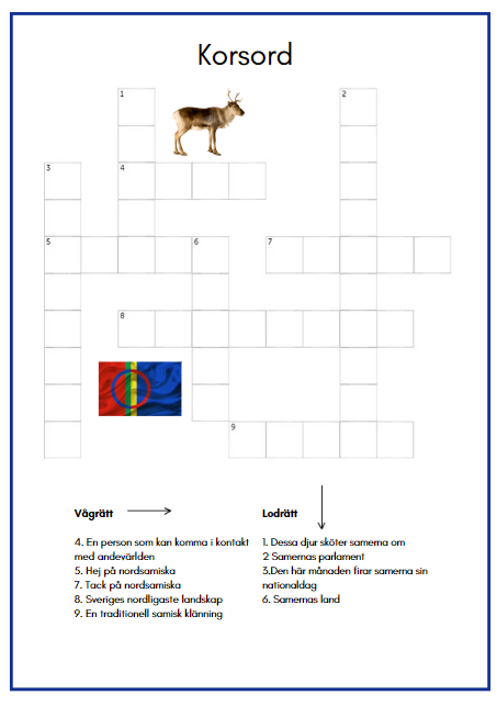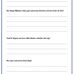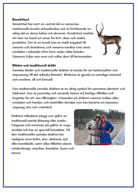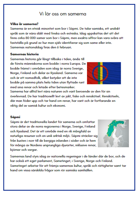 Ett häfte på 8 sidor som innehåller faktatexter om samerna med tillhörande läsförståelsefrågor. Här finns också korsord och en flagga att färglägga.