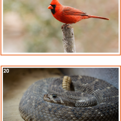 Materialet innehåller 22 bilder på djur med orange ram, 22 bilder på djur med svart ram och ett innehållskort. Sammanlagt 44 bilder.