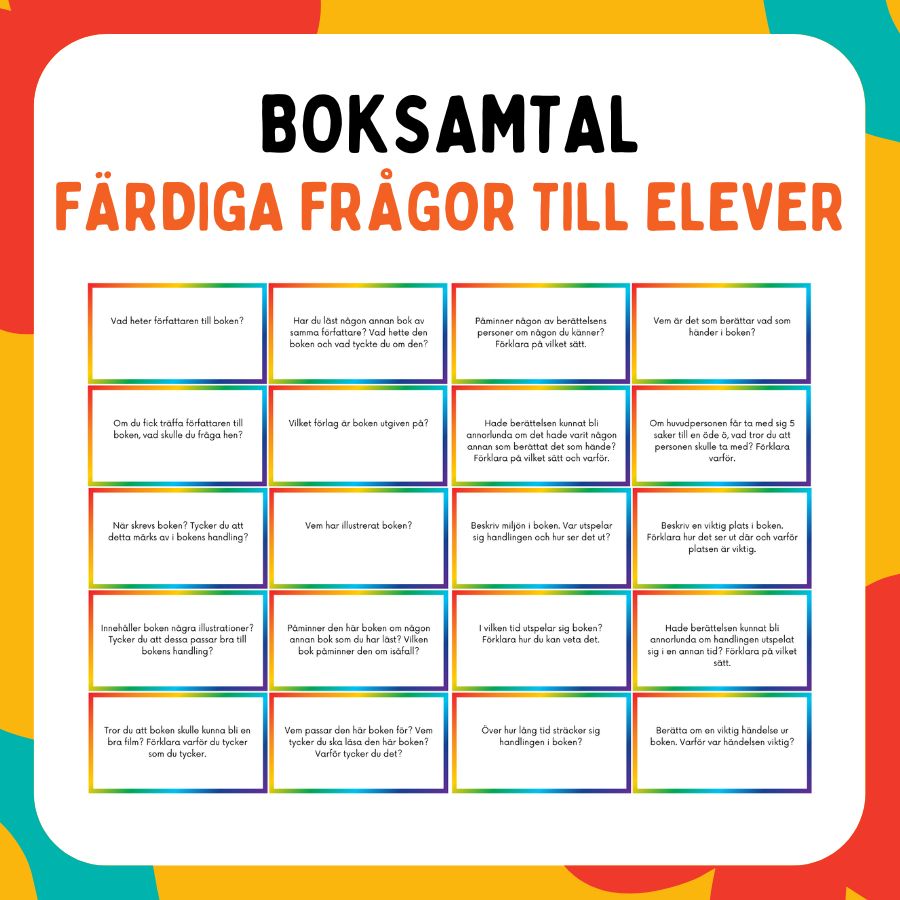 Samtalskort att använda till boksamtal i klassen. Innehåller 50 x olika frågor. Fungerar jättebra att laminera och dela ut till elever vid boksamtal.