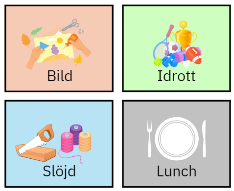 Schema skyltar med bildstöd för alla skolämnen i grundskolan. Kommer både i ljusa färger och utan färger.