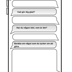 Därefter finns en tom mall där eleverna själva målar sin selfie. Där finns också mallar som skall se ut som skärmdumpar av en sms konversation på telefonen. Där finns färdigt ifyllda chattar med frågor för att lära känna eller berätta om sommaren eller sina mål. Men här finns också helt tomma mallar så att du själv skriver de frågor som du vill att eleverna svarar på.