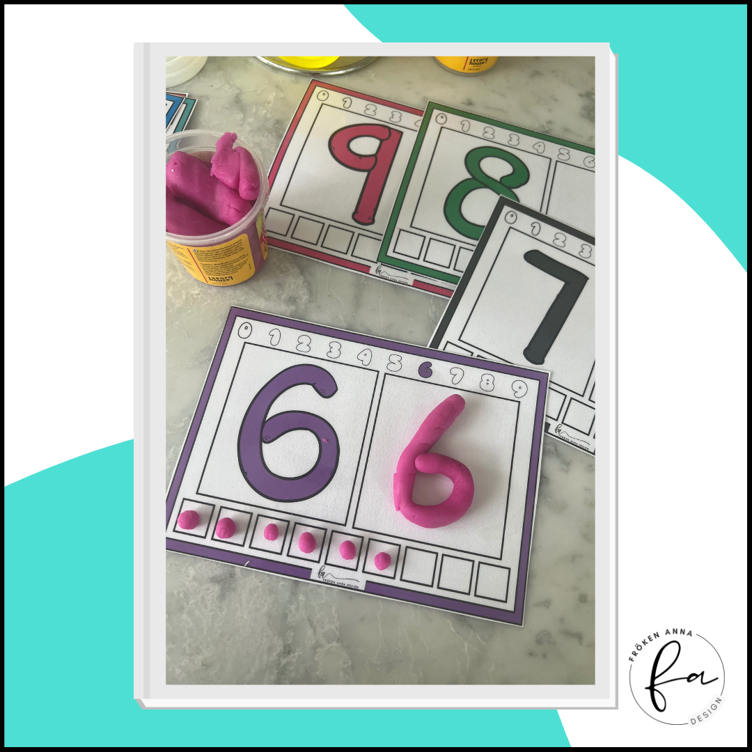 Lär dig siffror med lera. Forma siffran antingen genom att lägga leran på siffran, eller i rutan bredvid, samt lägga korrekt antal i rutorna.