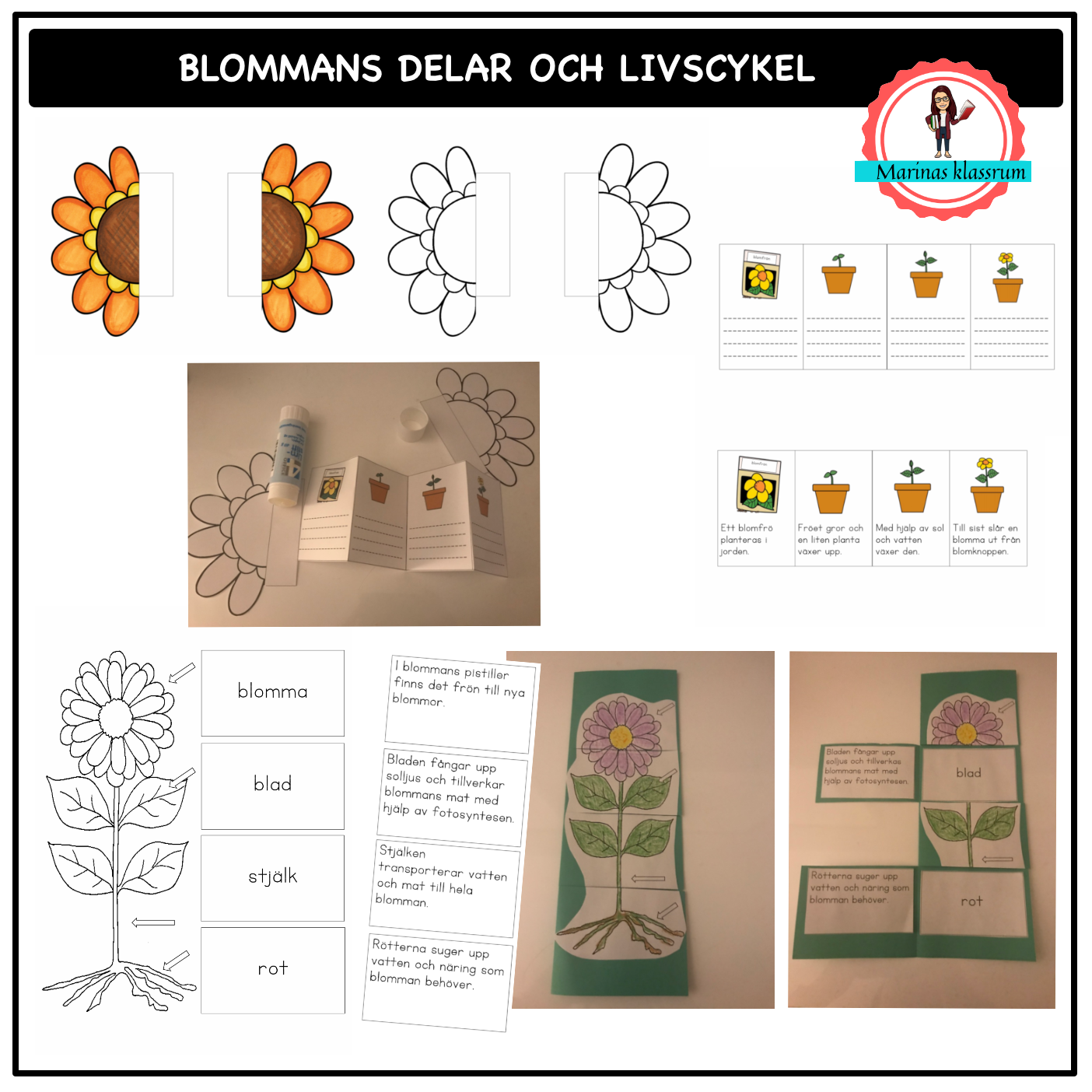 Med detta material kan eleverna skapa två ”vikböcker” en för blommans olika delar och vad de har för uppgift och en för blommans livscykel.