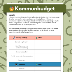En arbetsuppgift kopplad till ekonomi, politik och demokrati. Eleverna ska via en hemsida för en fiktiv kommun (solvik kommun) fördela skattepengarna. Detta gör eleverna via ett arbetsblad. Via hemsidan kan de läsa på om invånarna i kommunen och vad de olika kategorierna för skatt innebär. T.ex Samhälle och miljö innebär nybebyggelse, räddningstjänst, vägar, lekparker osv. Eleverna ska sedan motivera varför de fördelat pengarna som de har gjort och presentera ett cirkeldiagram för klassen av sin budget. Avslutningsvis ska eleverna rösta på den budget de tycker är bäst.