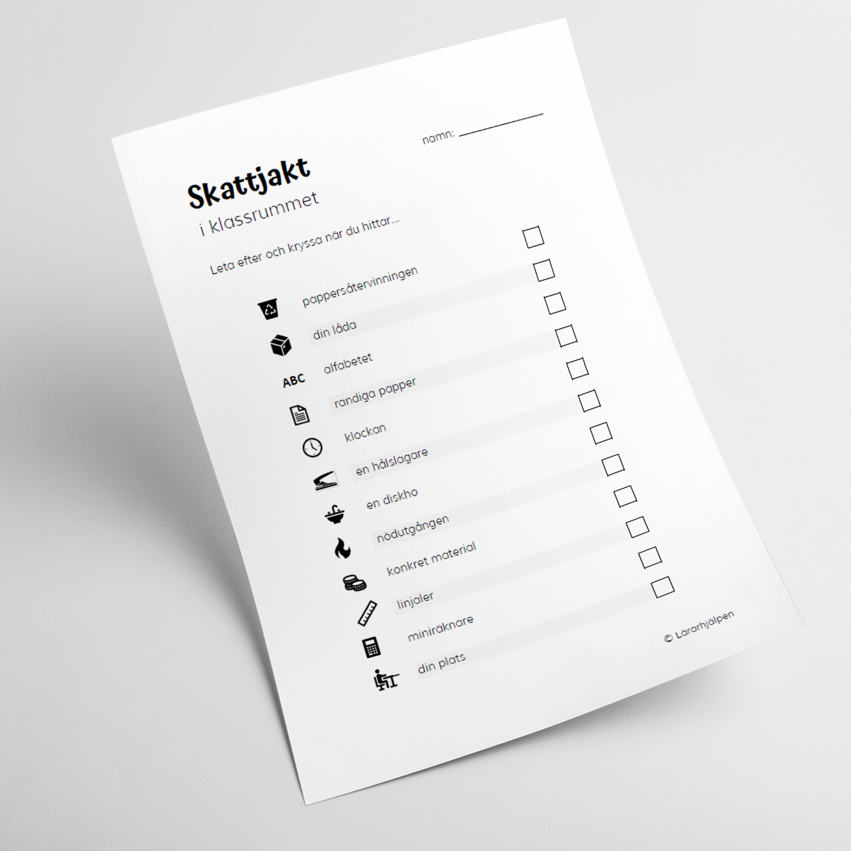 I början av ett nytt läsår kan dokumentet användas av elever för att orientera sig i klassrummet. Det underlättar för resten av läsåret om eleverna vet var material och annat finns i klassrummet. Det öppnar även upp för bra diskussioner om exempelvis nödutgång. Låt med fördel eleverna utföra jakten i grupper eller par. När de har hittat ett av föremålen kryssar de den rutan.