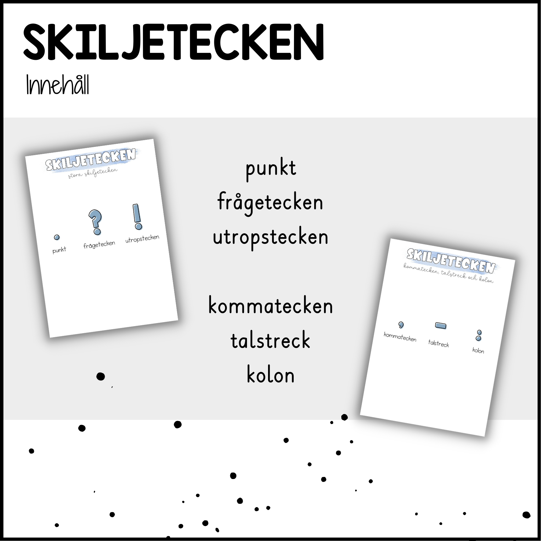 Detta material innehåller totalt 15 sidor varav 12 sidor är arbetsblad. Här får eleverna träna på skiljetecken så som punkt, frågetecken, utropstecken, kolon, kommatecken och talstreck. Passar från åk 3 och uppåt. Eleverna får lära sig om skiljetecknet, se exempel och träna sig på att använda dessa korrekt.