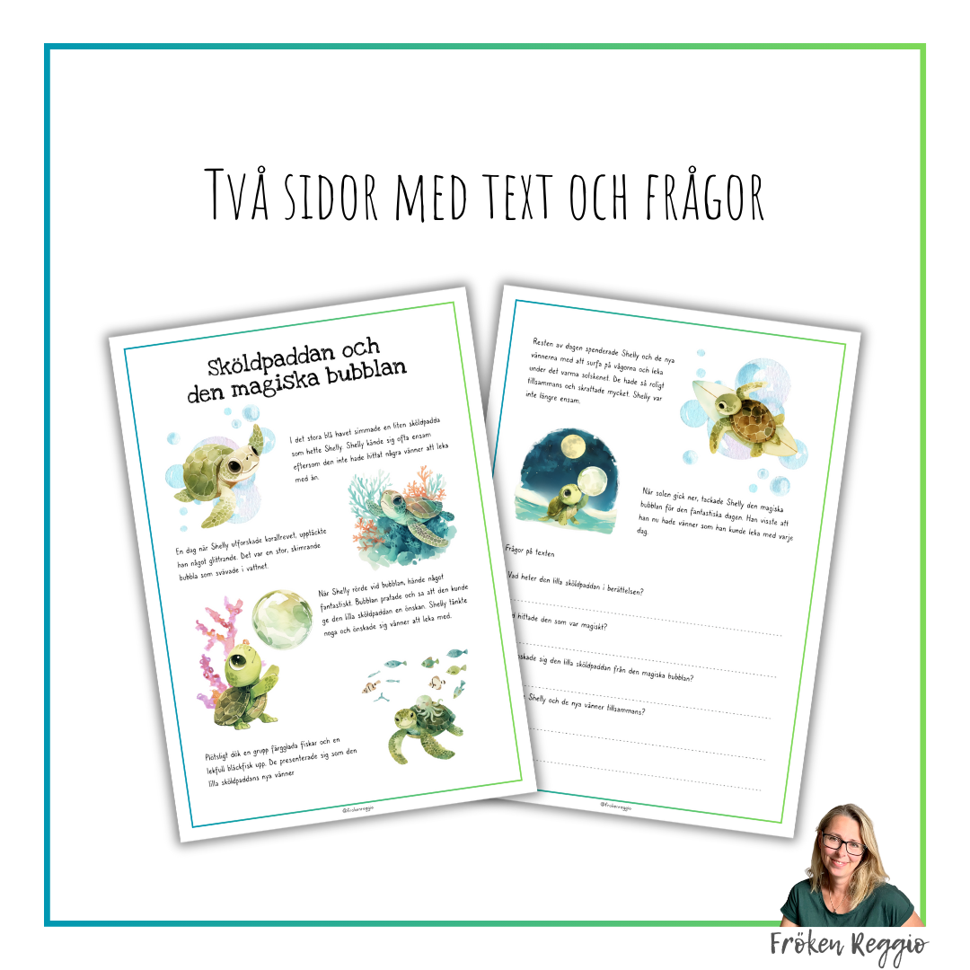 En saga om sköldpaddan Shelly med tillhörande läsförståelsefrågor.
