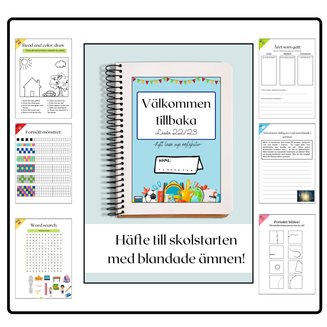 Ett häfte på 19 sidor (27 med facit och försättsblad) med blandade uppgifter för de första dagarna på läsåret! En mjukstart med uppgifter i SO, NO, Eng, SV, bild och matte! Skriv ut och kör eller välj ut passande uppgifter för din grupp! (Passar ungefär åk 3-6).