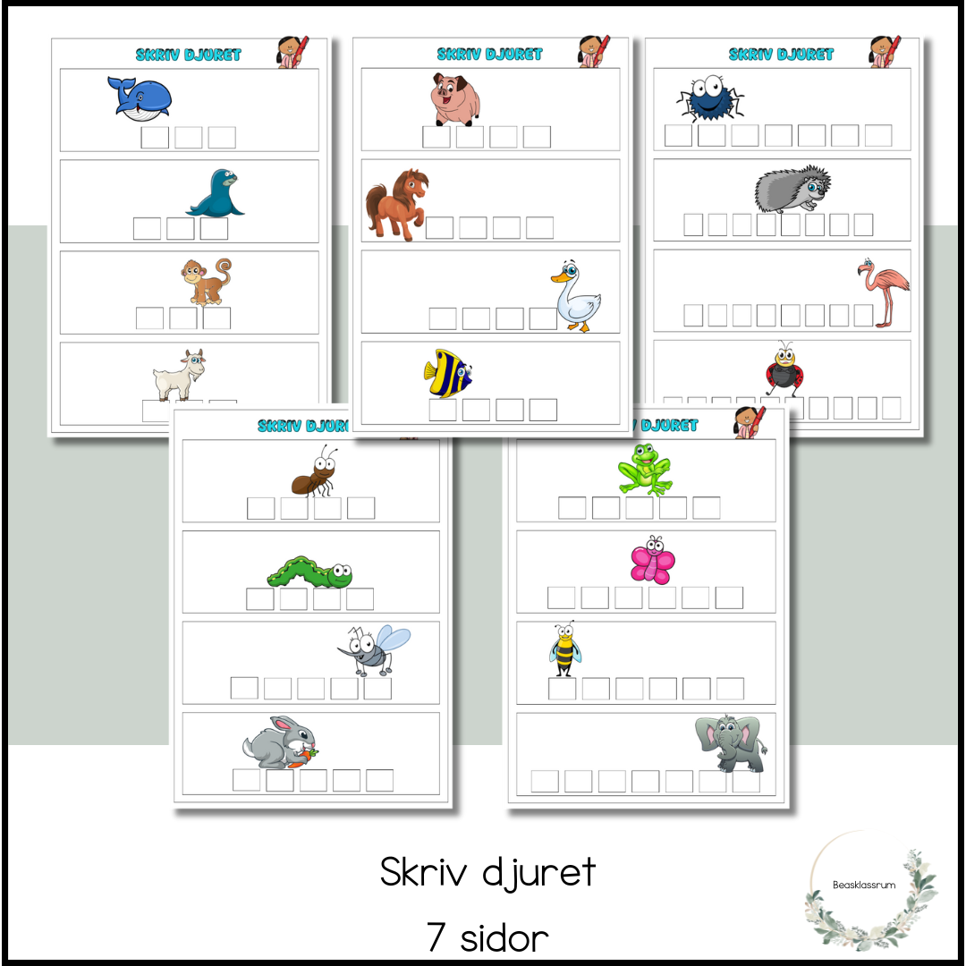 7 arbetsblad där eleverna tränar på att skriva djur.