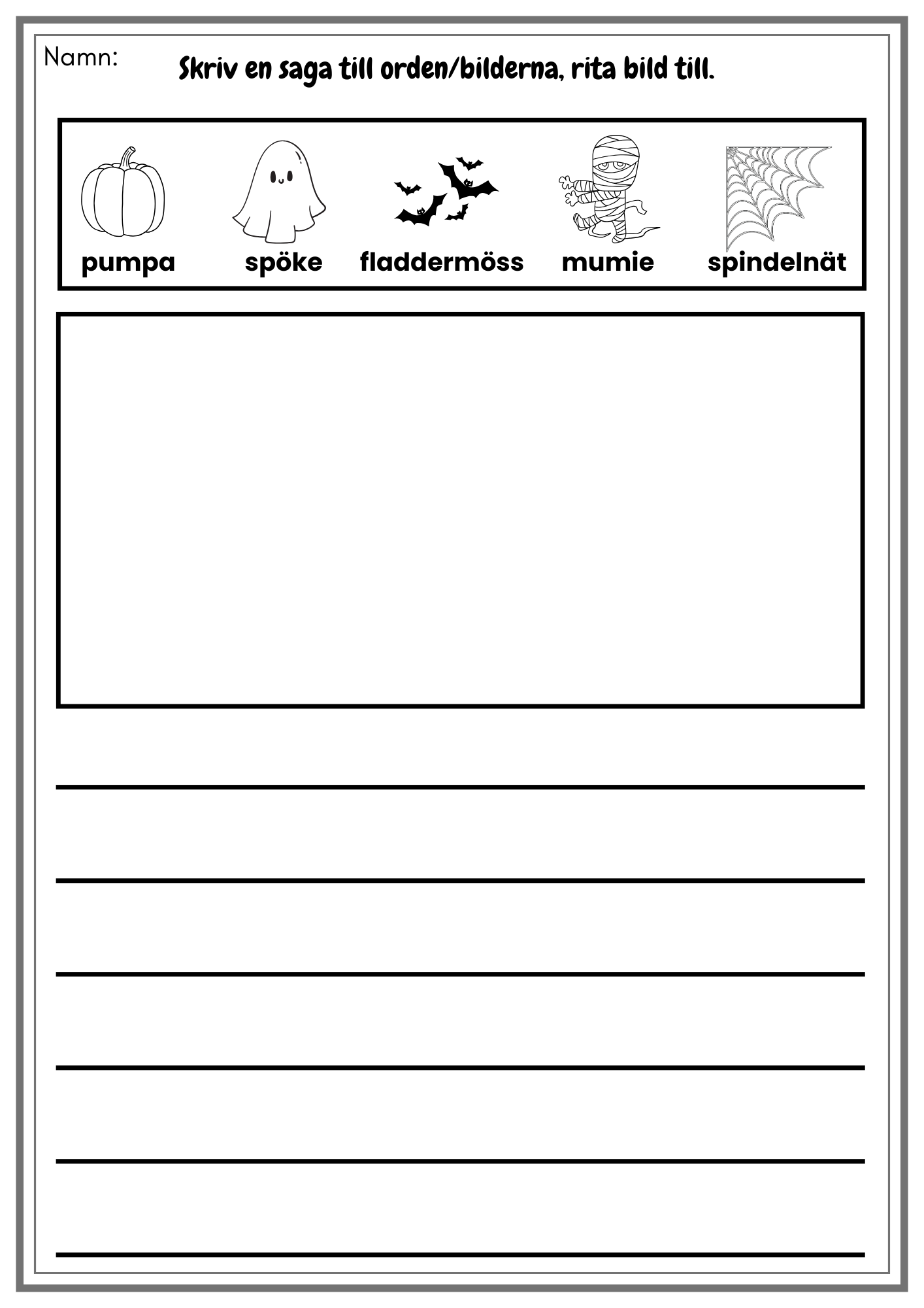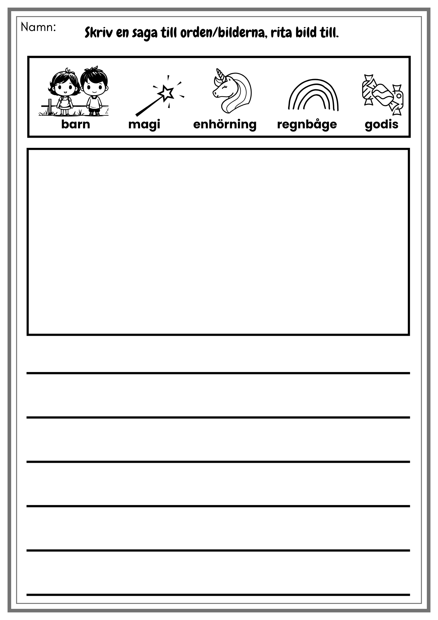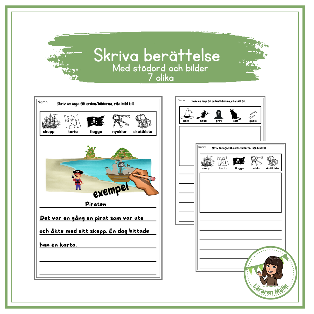 Träna på att skriva en berättelse och få hjälp med att få igång fantasin med dessa arbetsblad. Totalt 7 stycken olika. Varje arbetsblad har stödord/stödbilder som hjälper eleven att skriva sin berättelse.