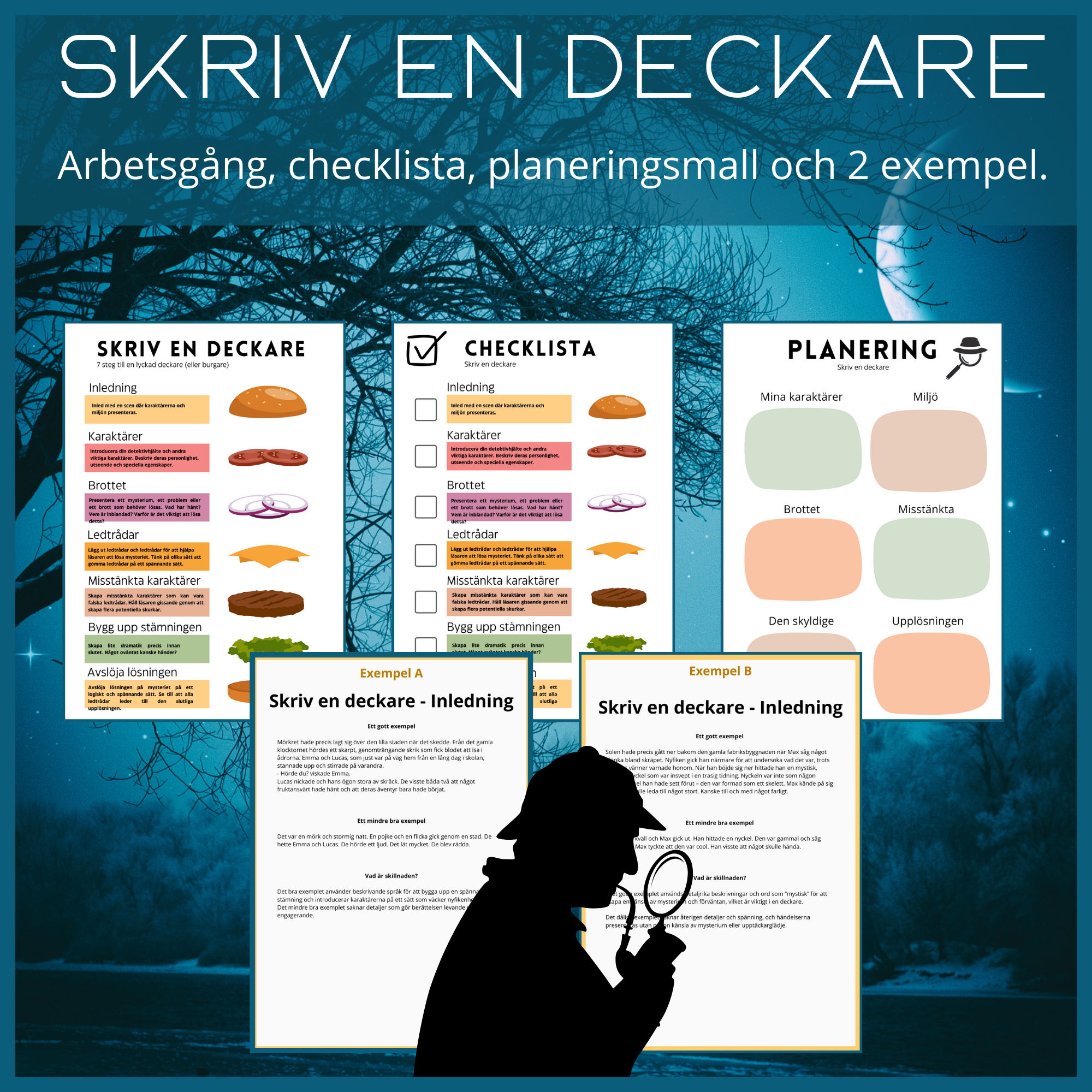 Detta ingår i Skriv en deckare! Arbetsgång, checklista, planeringsmall och 2 exempel.